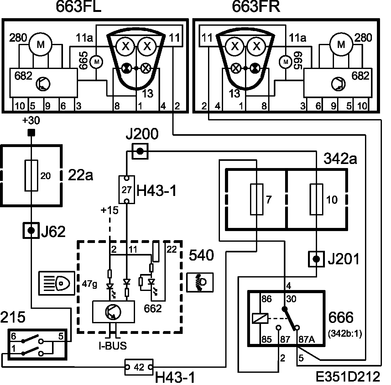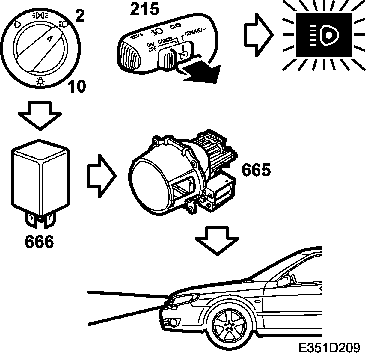 When the switch (215) is moved to its "spring-back" position with the lights on, voltage will be applied to the headlamp (663FL/663FR) pin 2 via fuse 7.