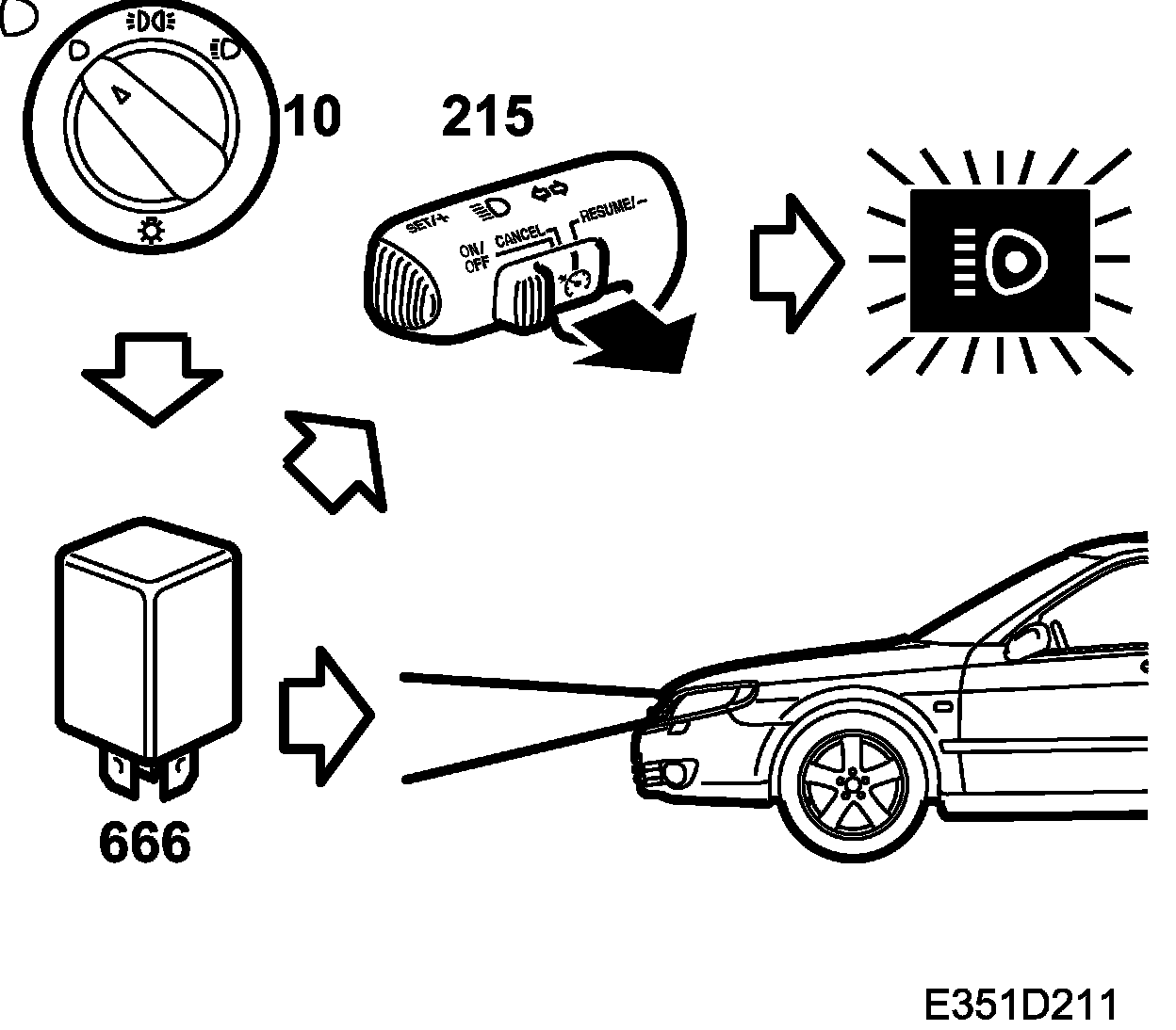 Main beam signal, as known as a "main beam flash", can be activated with the main/dipped beam switch (215) to the right of the steering wheel. The main beam flash can only be activated when dipped beam is active.