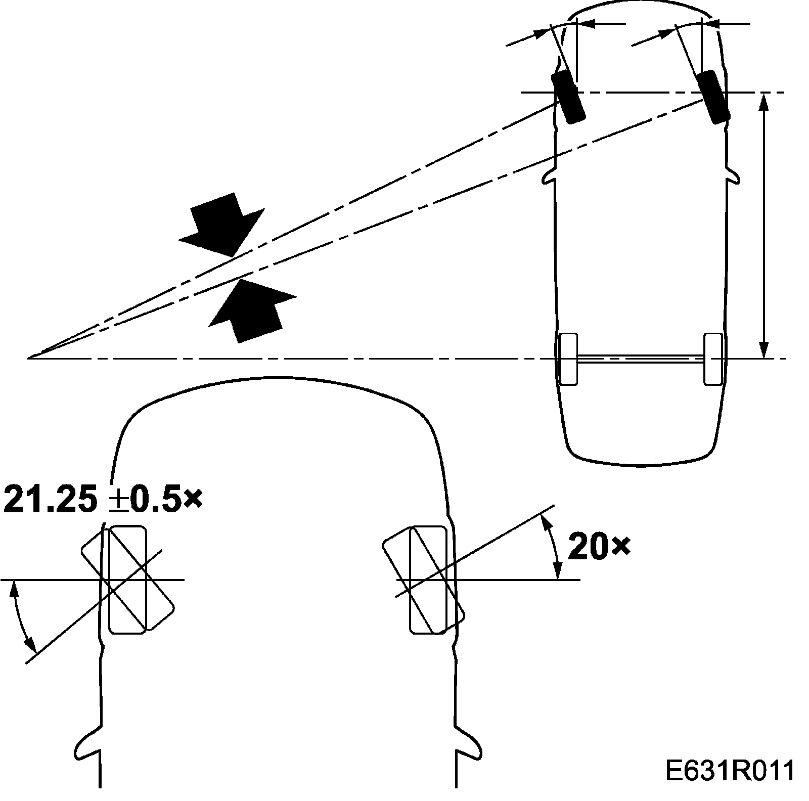 Turn the steering wheel to the left, for instance, until the right-hand (outside) wheel is at an angle of 20 degrees. If the steering angle is correct, the other (inside) wheel should be at an angle of 21.25 ± 0.5 degrees.