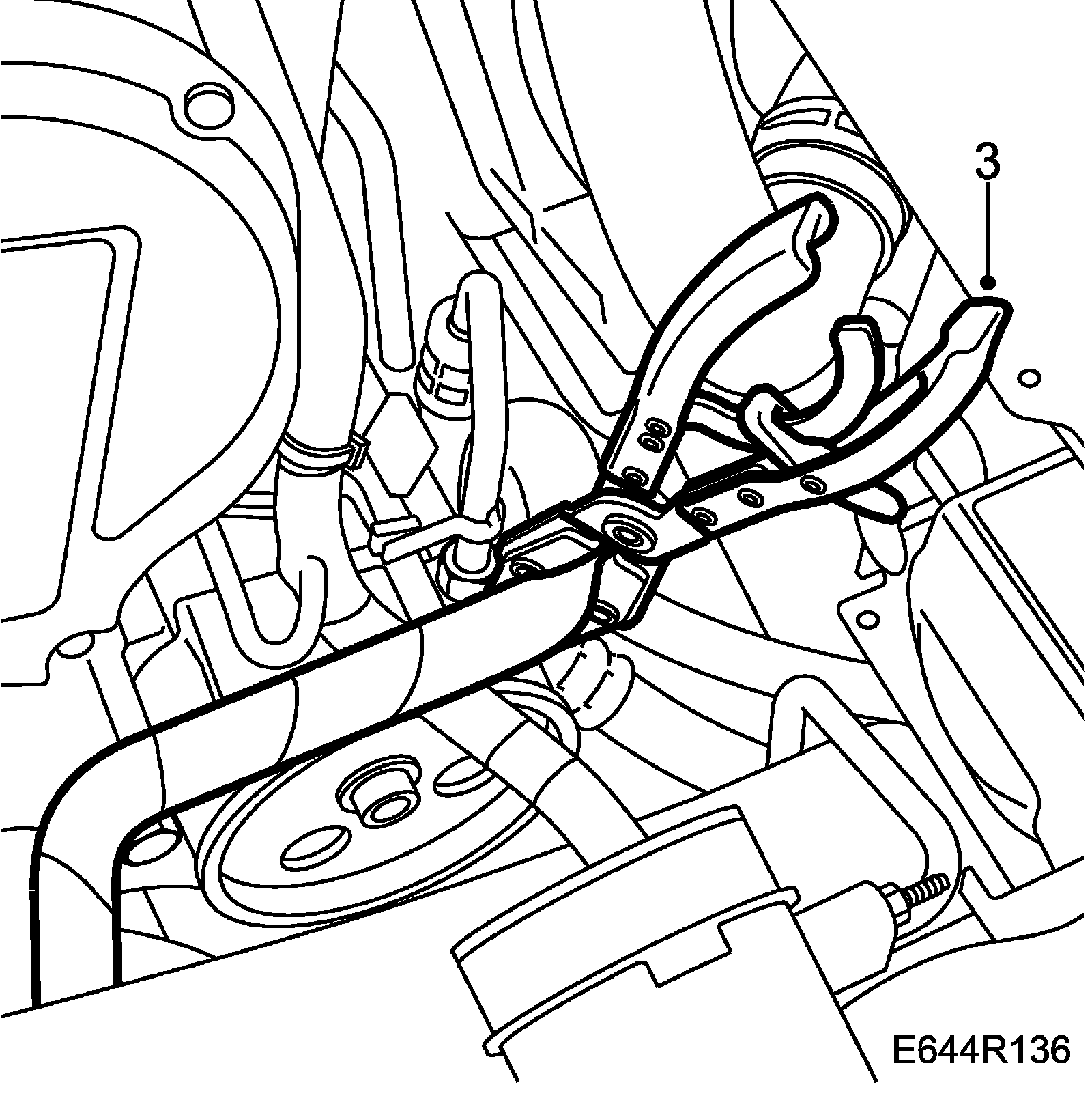 3. Clamp the intake hose of the power steering pump and the return hose to the reservoir with two 30 07 739 Pinch-off pliers.