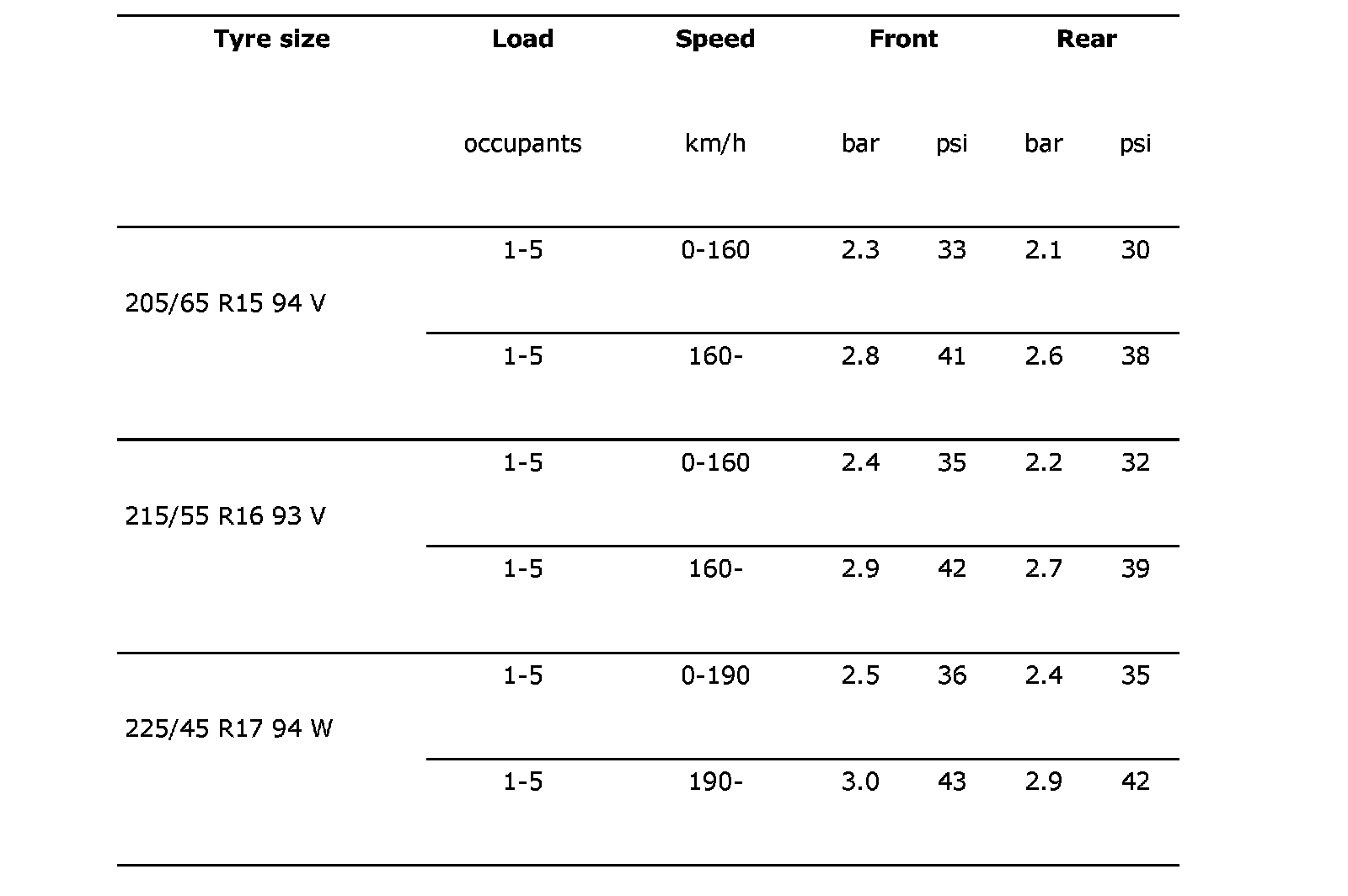 The following values for air pressure apply at 20°C. The air pressure will rise and drop 0.1 bar (2 psi) respectively for each 10°C change in temperature.