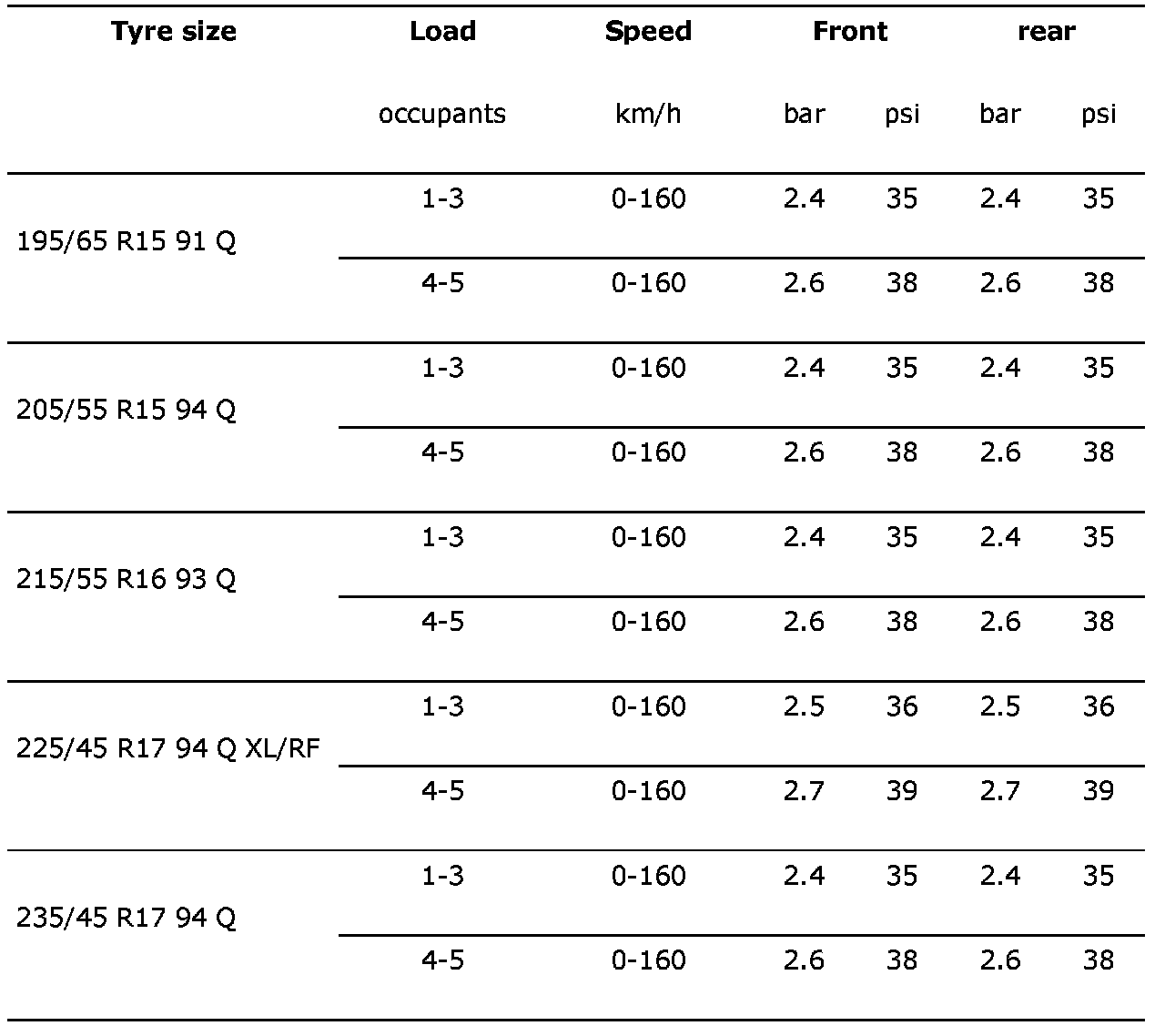 The following values for air pressure apply at 20 degrees C. The air pressure will rise and drop 0.1 bar (2 psi) respectively for each 10 degrees C change in temperature.
