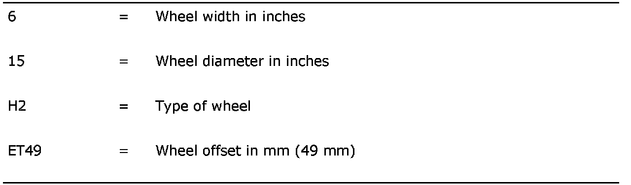 WheelsThe wheel is centered directly on the hub. In addition, the wheel bolts are tapered to locate the wheel correctly. The wheel designation 6J x 15 H2 ET49 means: