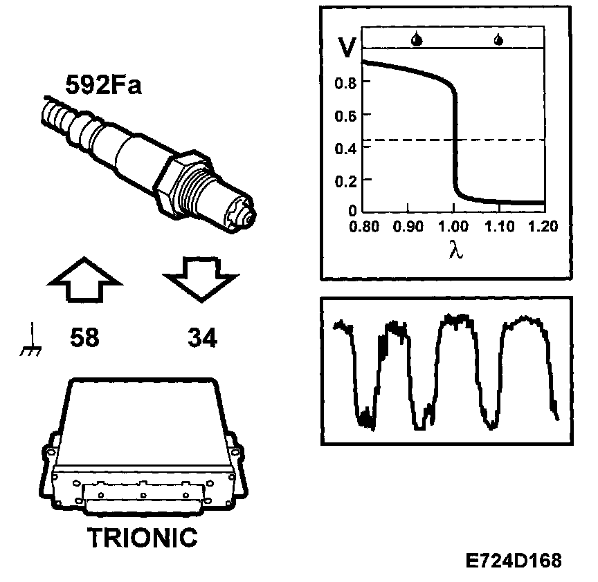 When the exhaust gases pass the oxygen sensor, their oxygen content is measured by a chemical reaction. The output voltage of the oxygen sensor is proportional to the current oxygen content, which is an indication of the composition of the air/fuel mixture. If the engine receives a richer mixture than normal (lambda below 1), the oxygen sensor output voltage will be approx. 0.9V. If the engine fuel mixture is leaner than normal (lambda above 1), the oxygen sensor output voltage will be approx. 0.1V.