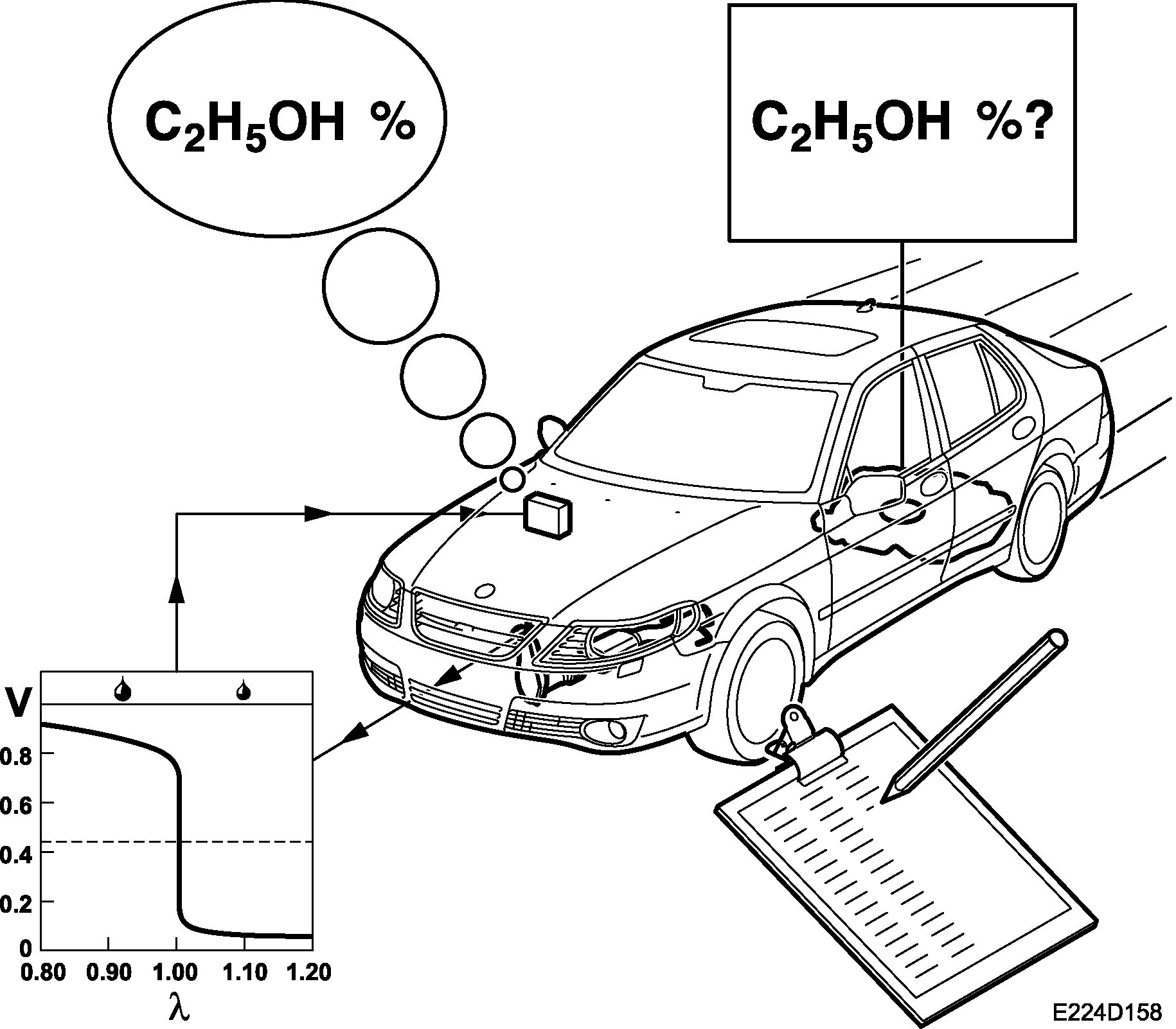 If the vehicle is run on pure petrol and then refuelled with E85, then lambda sond 1 (before the catalytic converter) will indicate lean running. The lambda control is then increased (increasing fuel quantity), at the same time the recalculation factor is decreased from 14.7 to a lower value, minimum 9.8. This continues until lambda sond 1 indicates that a mixture ratio of lambda 1 has been obtained. The recalculation factor is a measurement of the current ethanol content in the fuel. 14.7 means pure petrol, while 9.8 means that the ethanol content is 85%.