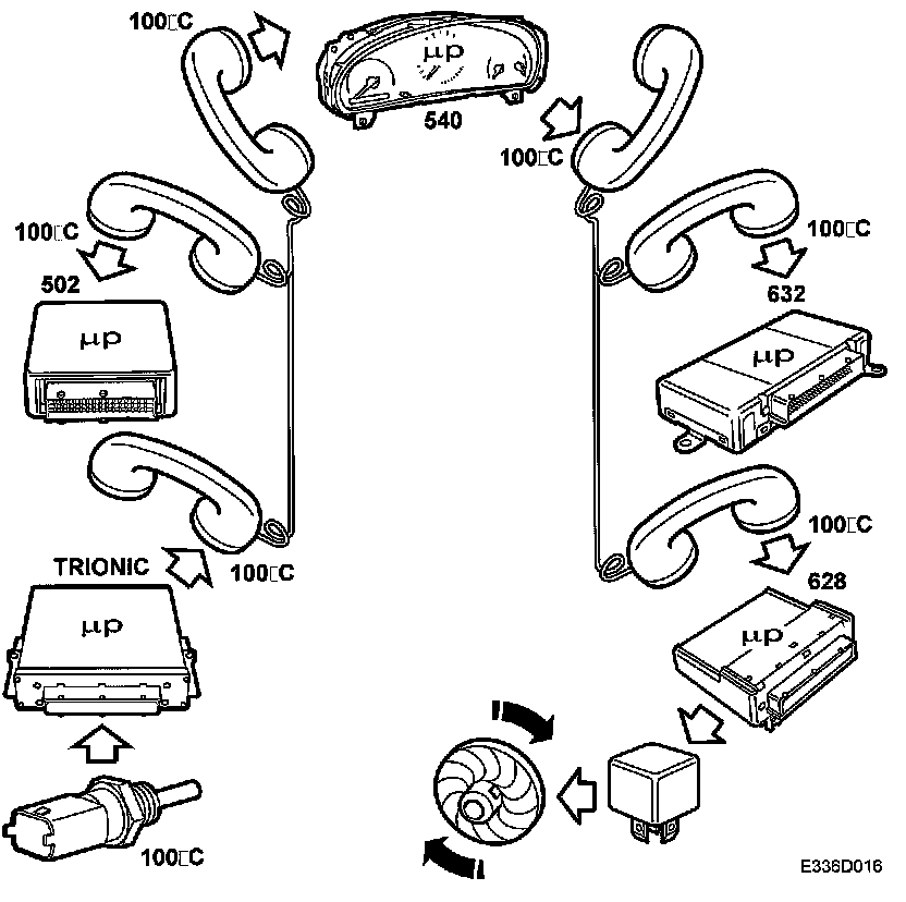 The coolant temperature is used by DICE for controlling the radiator fans (see illustration), by the MIU for controlling the temperature gauge, and by the ACC for controlling ventilation fan speed and air distribution during cold starts.