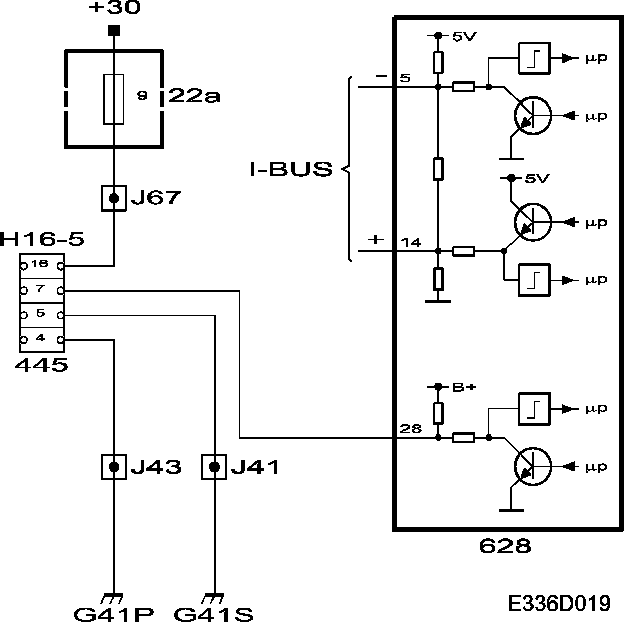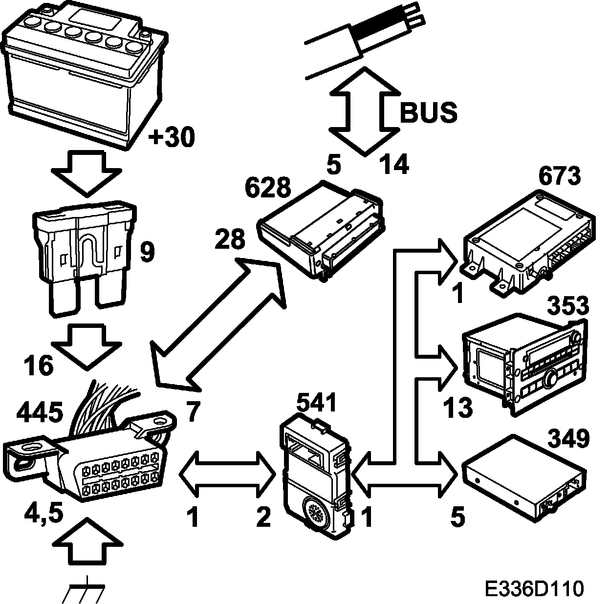 The diagnostic tool communicates directly with the connected control modules via the 1-lead Ibus. The EHU and SDAR control modules on the 1-lead I-bus are connected to pin 1 of the data link connector via an internal connection (between pins 1 and 2) in the SID control module.