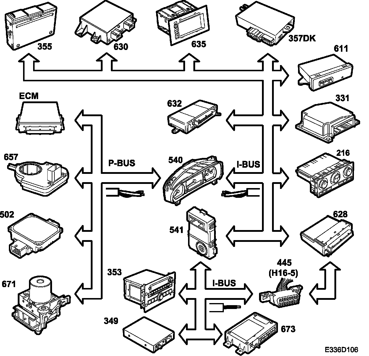 All information transmitted by a control module can be accessed by all other control modules connected to the bus. The MIU and SID control modules are responsible for ensuring that information accessible to the control modules of any of the buses is also available to the other bus-connected control modules. MIU is connected to both the P-bus and the dual-lead I-bus. MIU serves as a gateway between the P-bus and the I-bus. The SID control module is connected to both the dual-lead and the single-lead I-bus. The SID control module serves as a gateway between the two I-buses.