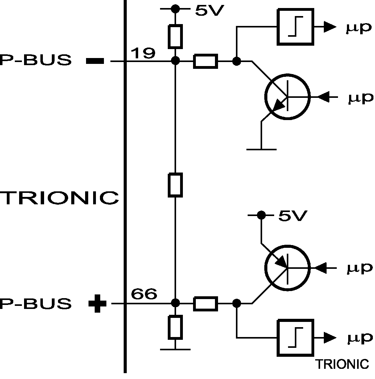 The two bus leads are supplied with approximately 2.5 V from each control module. The voltage is achieved by means of three resistors connected in series between 5V and ground. The middle resistor causes the voltage on bus+ to be slightly lower than bus- when no message is being transmitted.