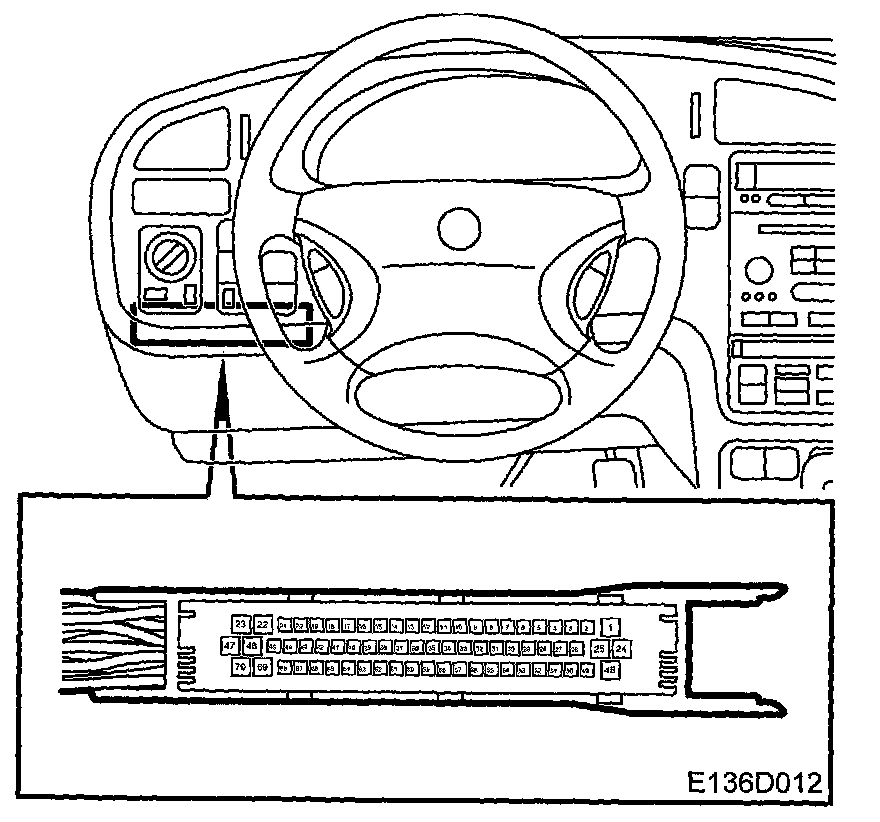 The DICE control module is located above the main relay board (LHD) and adjacent to the main relay board (RHD). It is connected to the system components with a 70 pin connector.