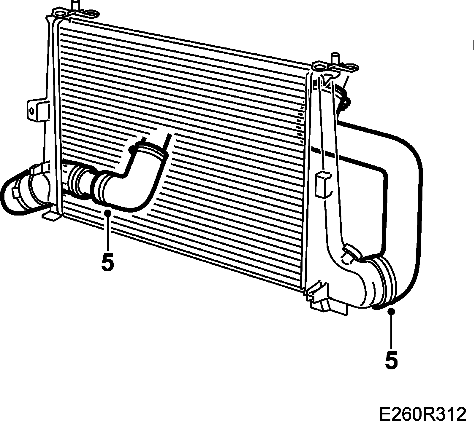6. Undo the hose clips on the charge air cooler's inlet and outlet connections. Remove the hoses. Remove the fasteners securing the charge air cooler to the body.