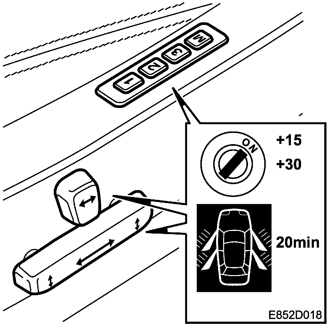 When the ignition is OFF and one of the front doors is open, the seat can be adjusted for 20 minutes. If the door is closed and then opened again, a further period of 20 minutes begins.