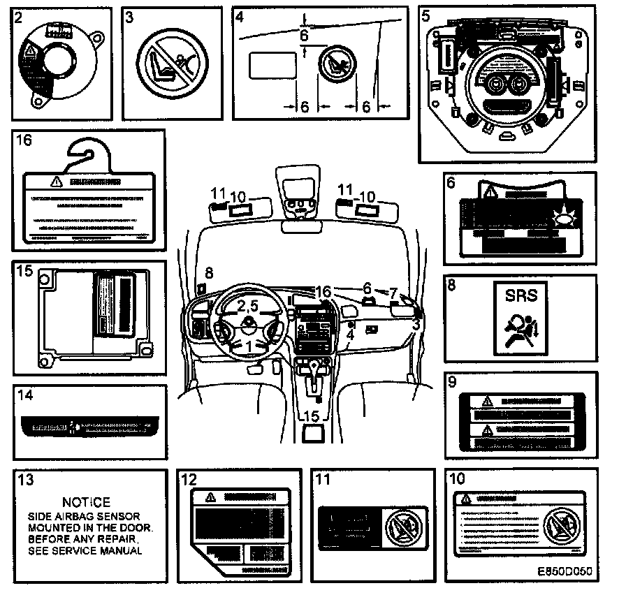 4. A "child safety seat prohibited" symbol is affixed to the dashboard beside the glove box on the left. The label is attached by the dealer (applicable to cars with an airbag on the passenger side, SE and FI).