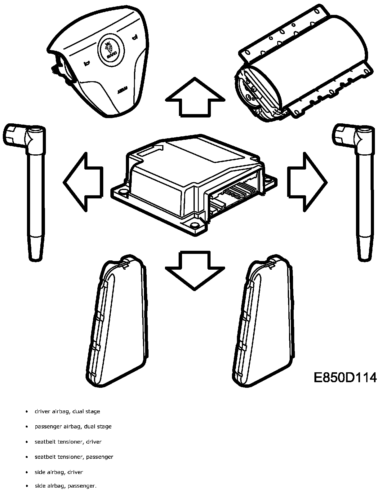 The primary acceleration sensor measures acceleration and retardation forces in the car both longitudinally and laterally. The control module retrieves information from two front impact sensors located in the front of the car to detect impact intensity as early as possible. A side impact sensor in each of the front doors sends the control module information on impact intensity from the side. This data is used together with signals from the belt buckle switches to calculated if and how the airbags and seat-belt tensioners should be activated.