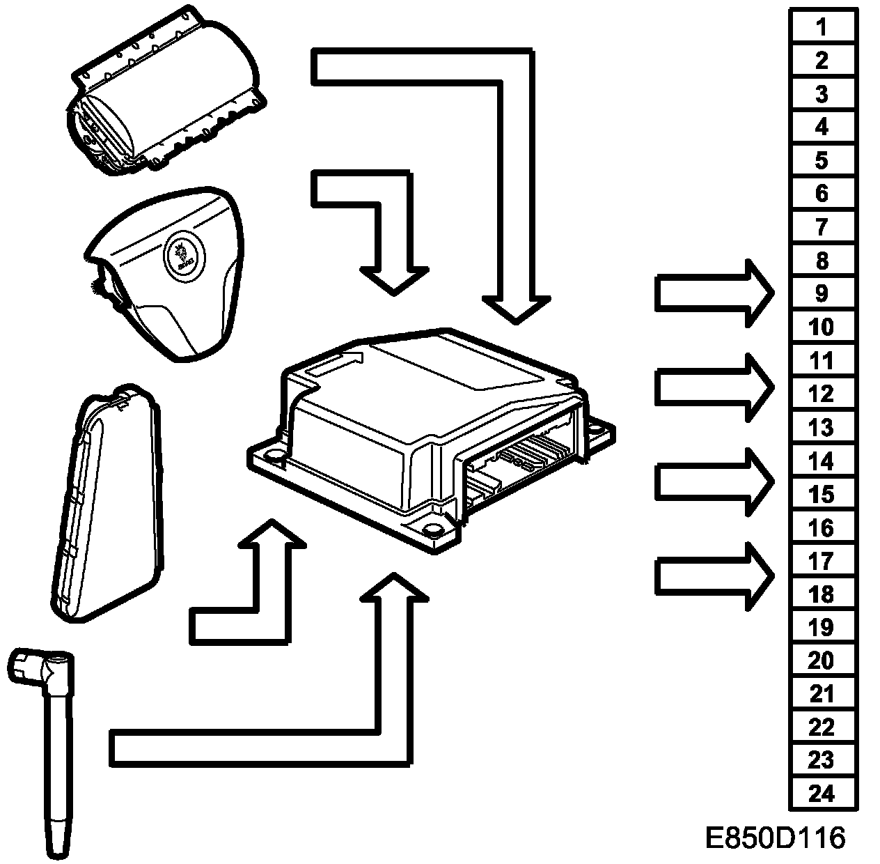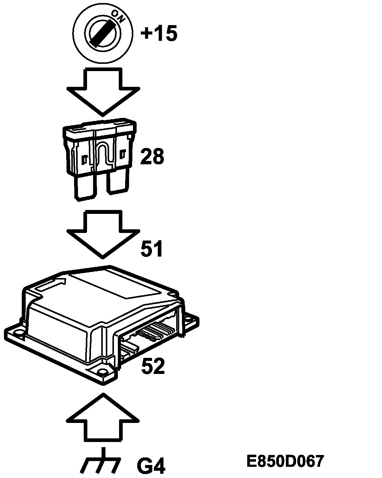The control module is connected to ground via pin 52 and the three retaining screws. No ground cables from other systems may be connected to the retaining screws as this could cause malfunctioning of the airbag system.