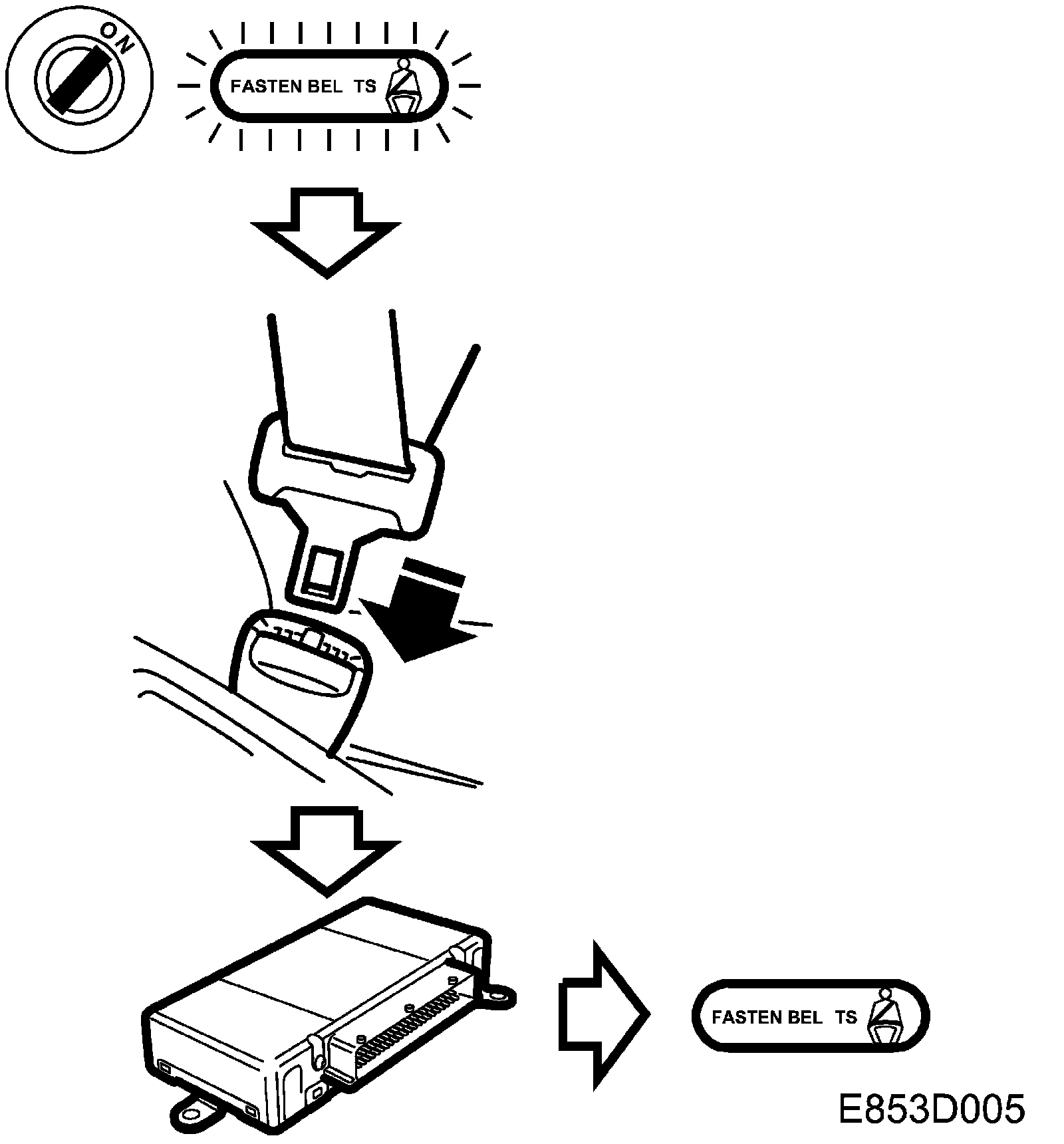 The passenger seat contains a sensor which detects if the seat is occupied/loaded. Each seatbelt buckle has a switch which is connected to the airbag control module. If the seatbelt is not fastened, the control module sends a reminder that is indicated as follows: