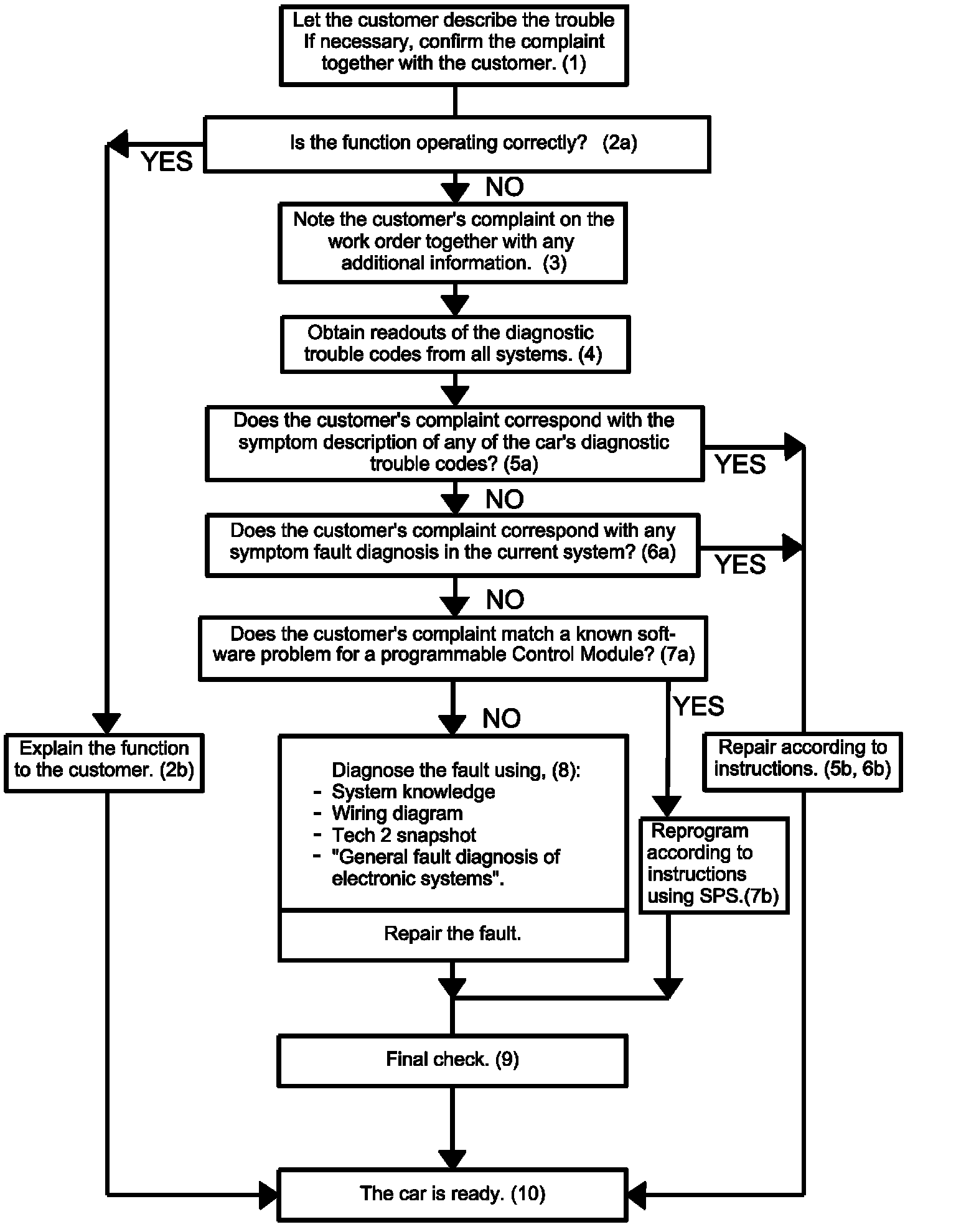 Saab's fault diagnosis strategy assumes that the technician is familiar with the customer's description of the problem. So note the customer's complaint and any other observations on the job sheet.