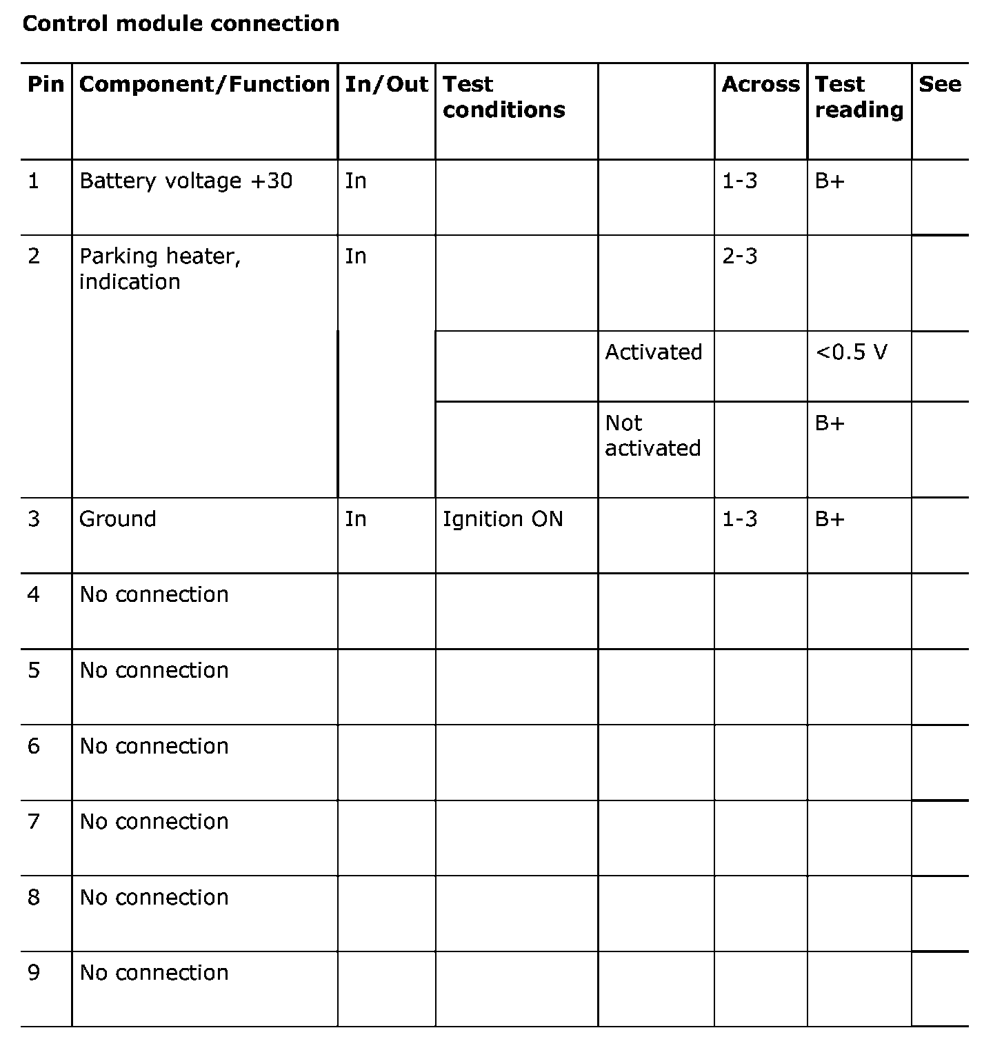 Test Readings, Control Module Connections