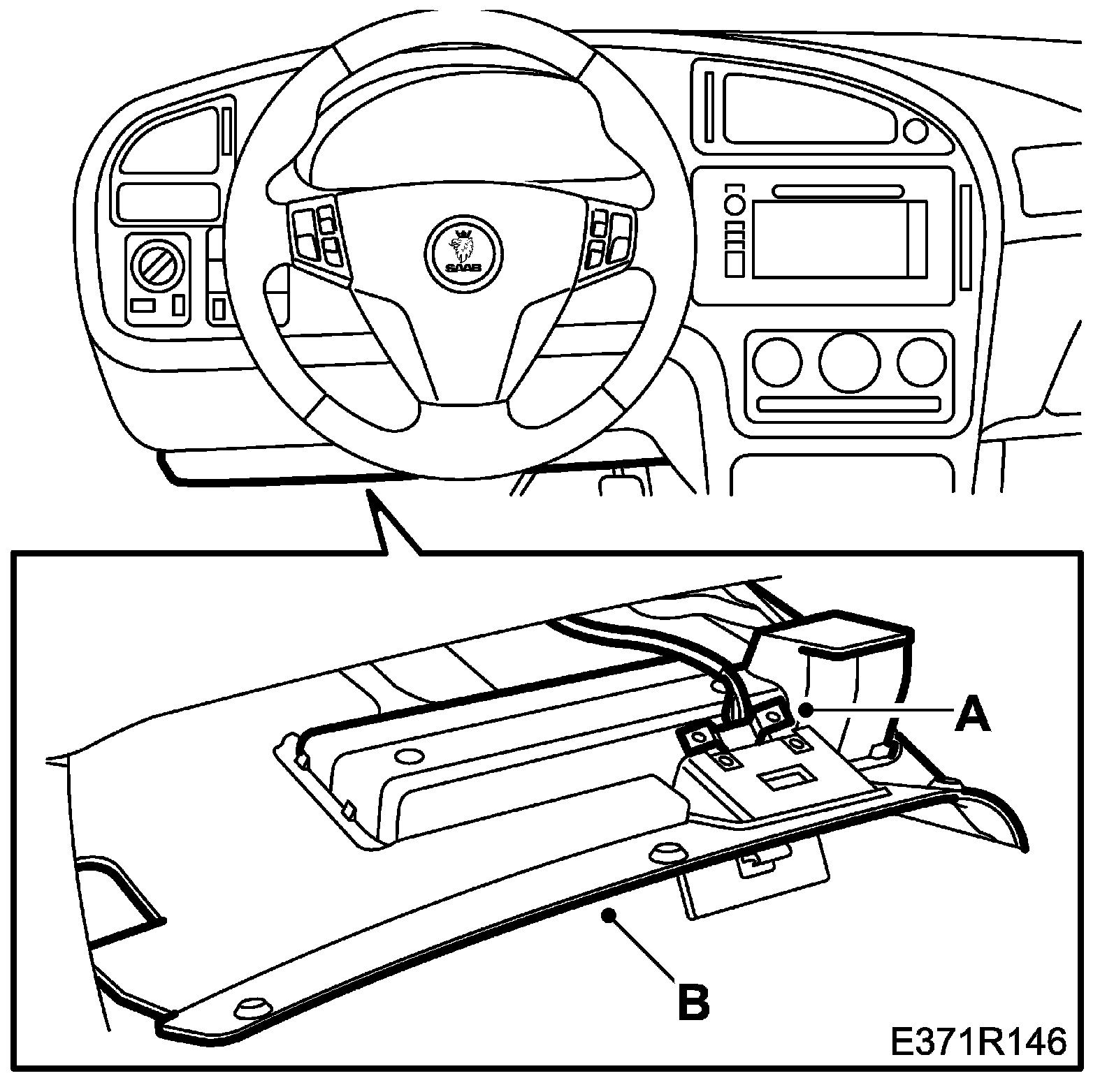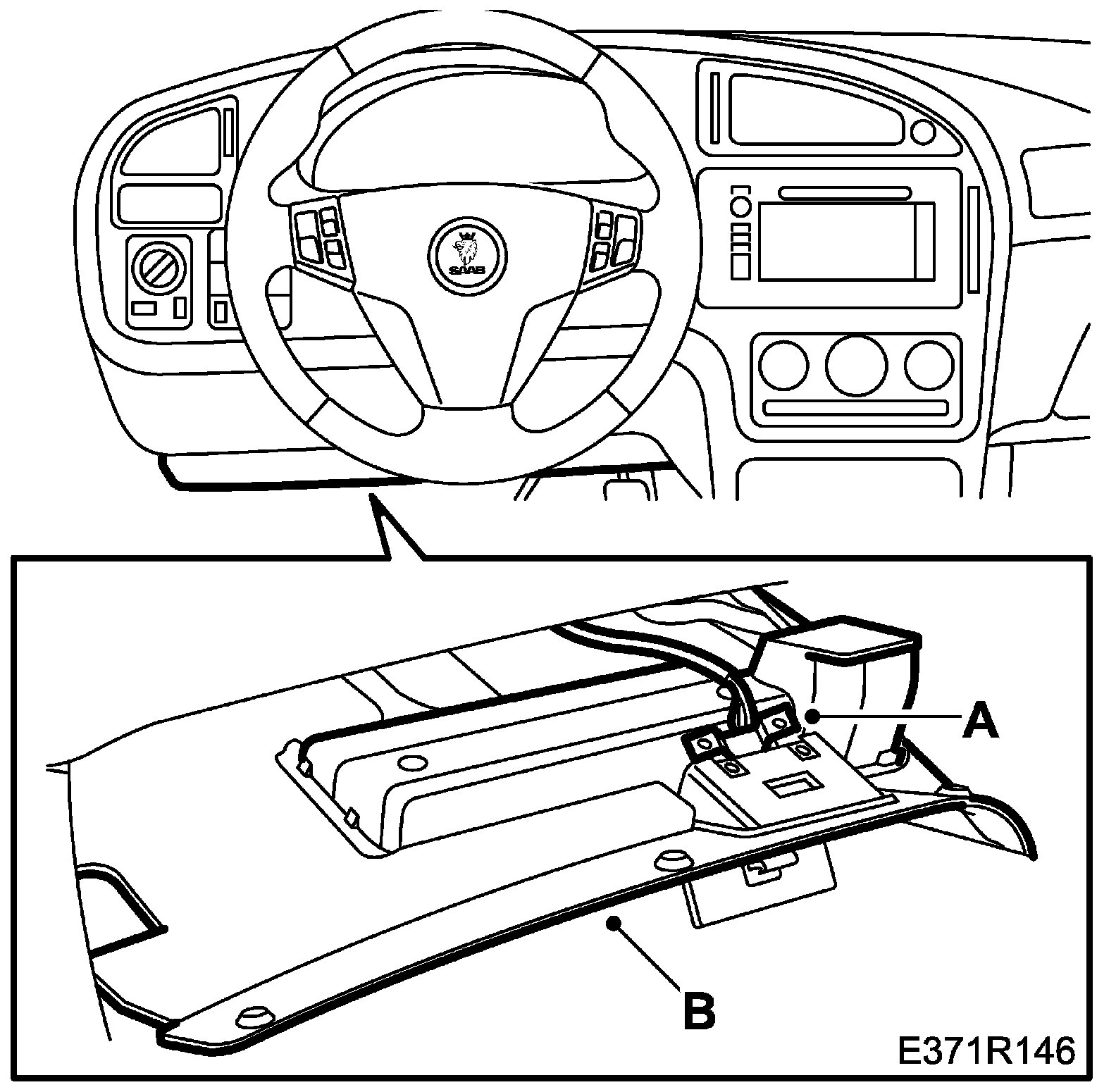10. Attach the switch for the airbag control module (A), and attach the wiring harness fixing (B).