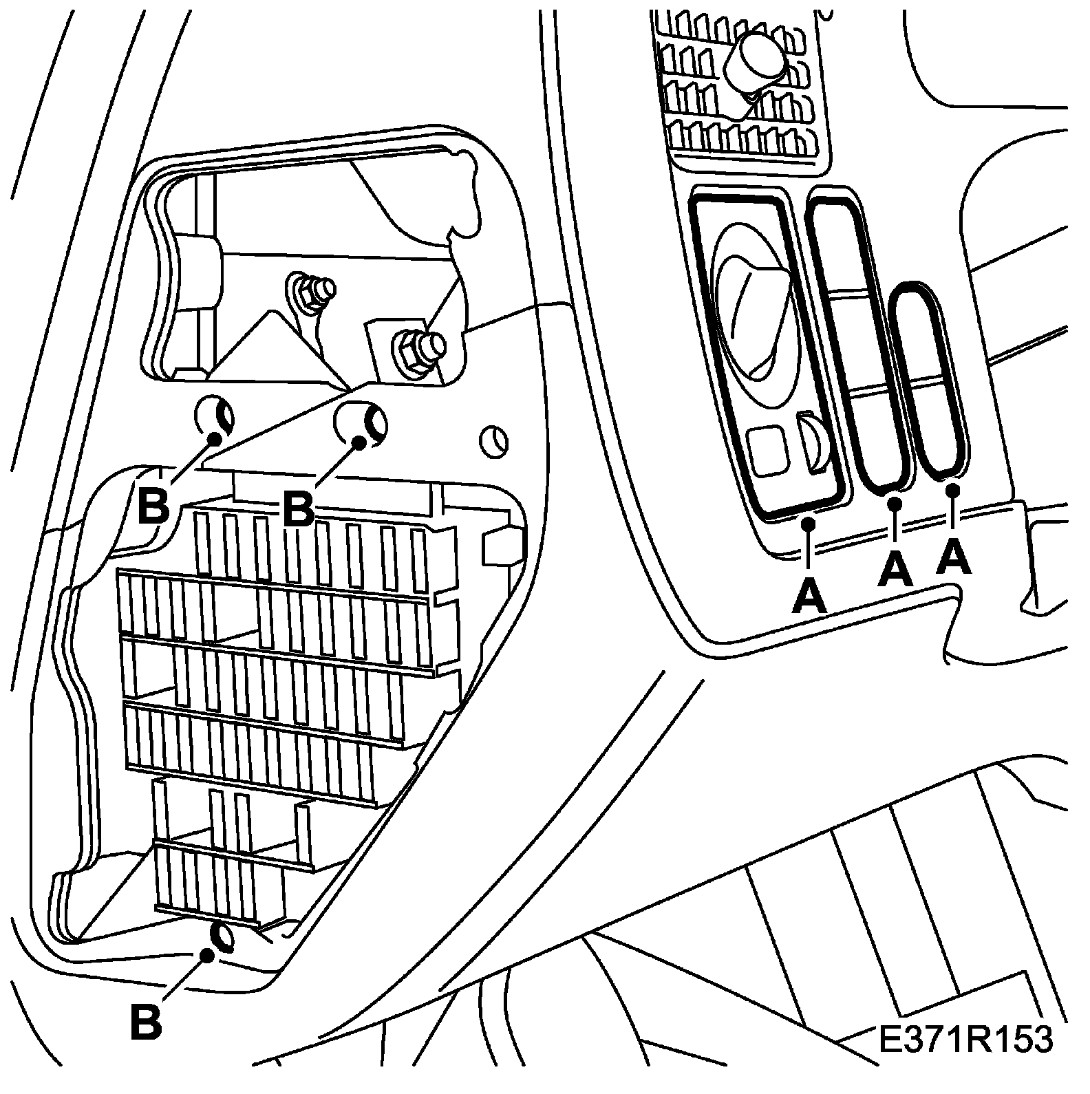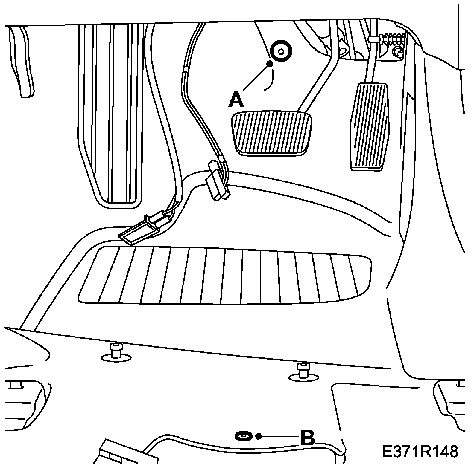 17. Remove the mat's two-stage rivets (B) on the driver's side.