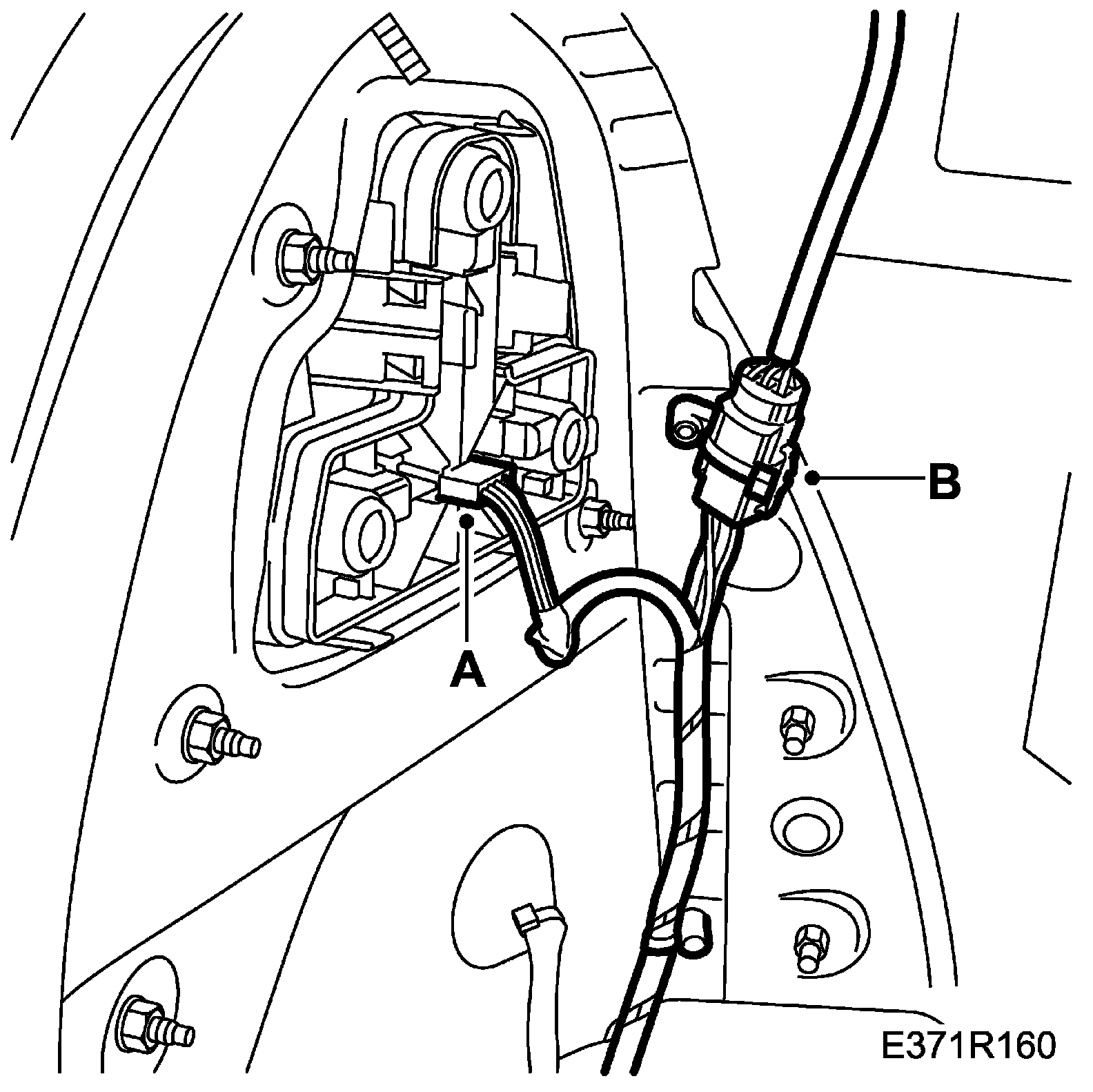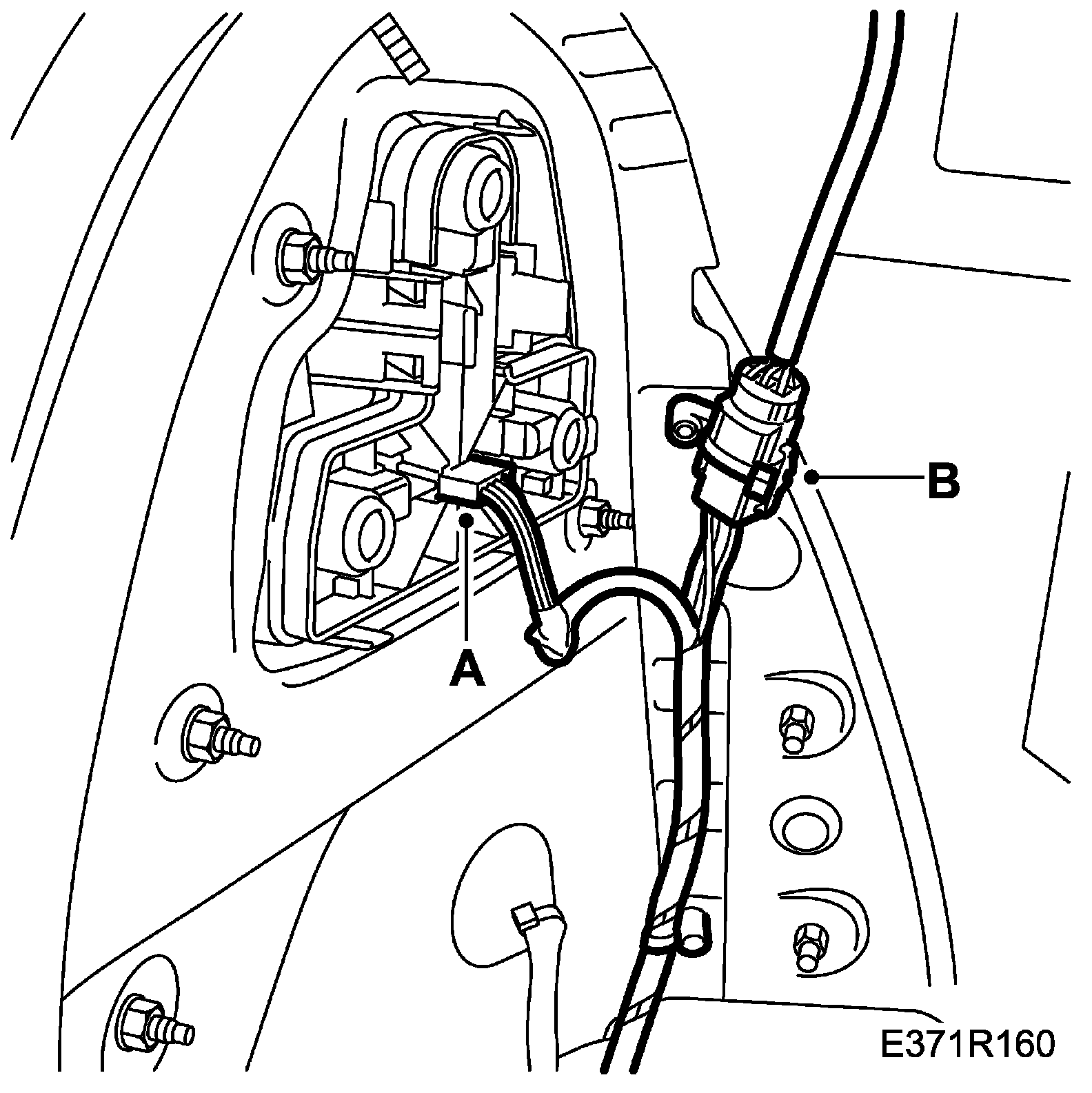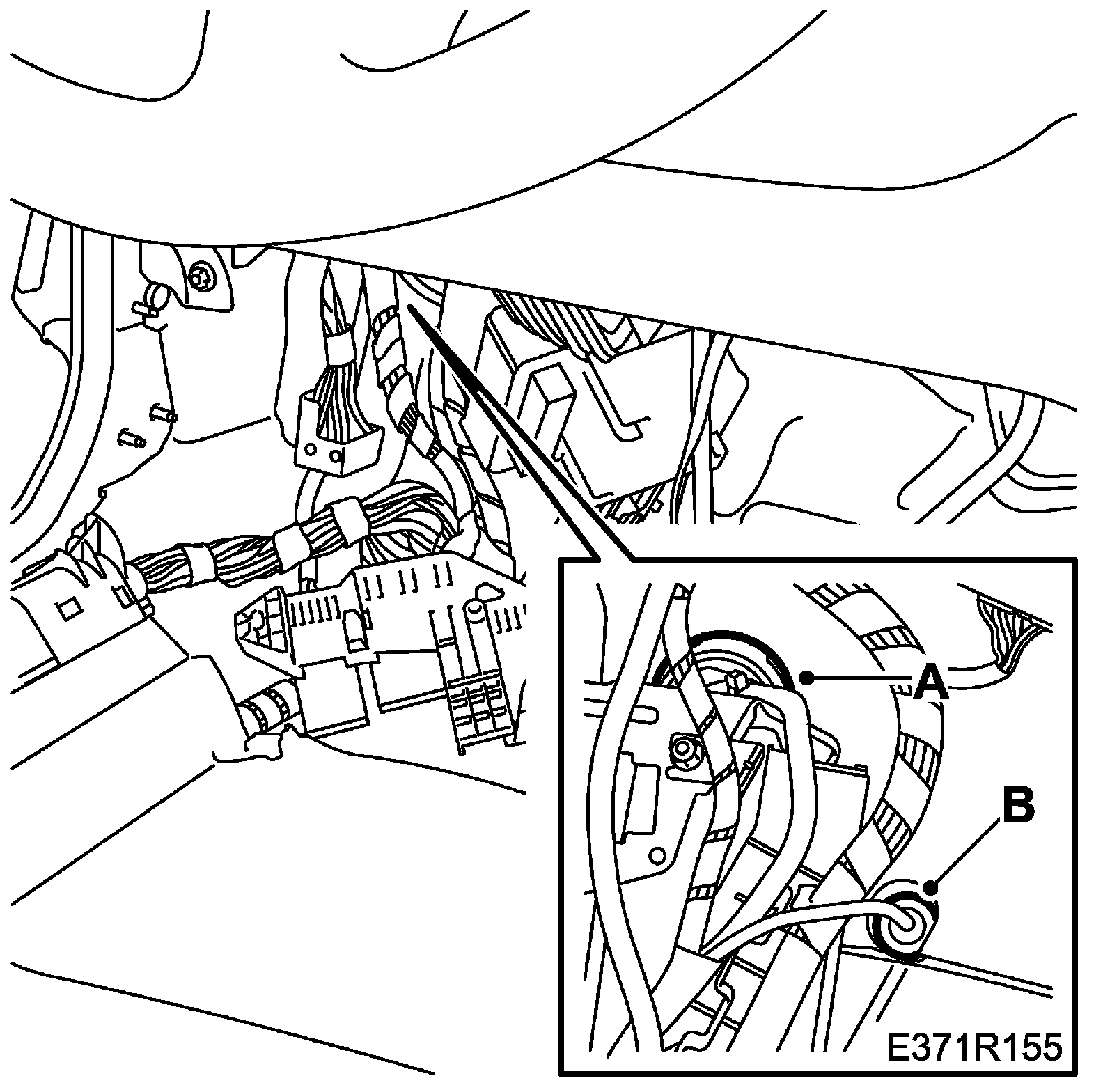 60. Remove the rubber grommet for the right-hand front door's wiring harness and route the wiring harness into the passenger compartment (B).