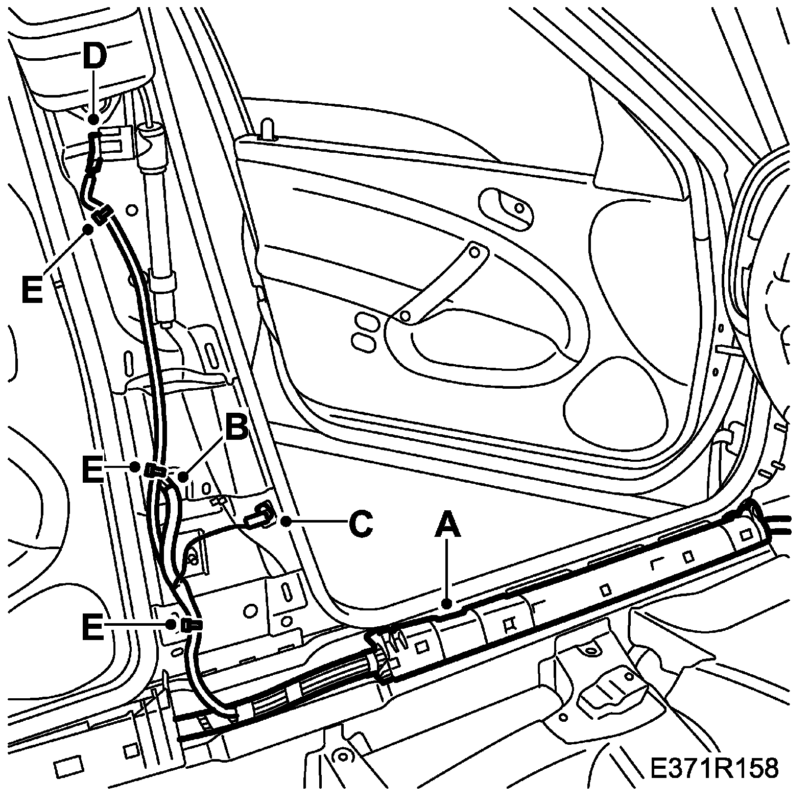 31. Attach the wiring harness clips to the B-pillar (E).