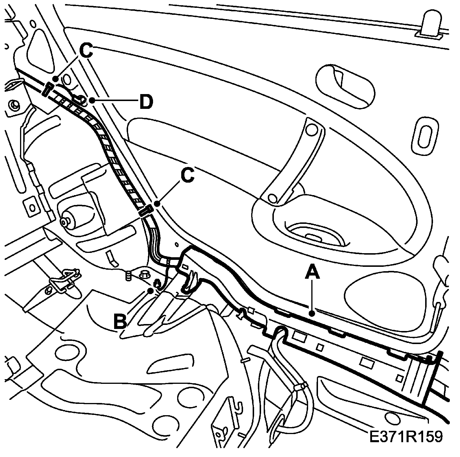 28. Attach the wiring harness duct for the left-hand rear door (A), fit the grounding point (B) by the rear seat. Attach the wiring harness fixings (C) and fit the door switch (D).
