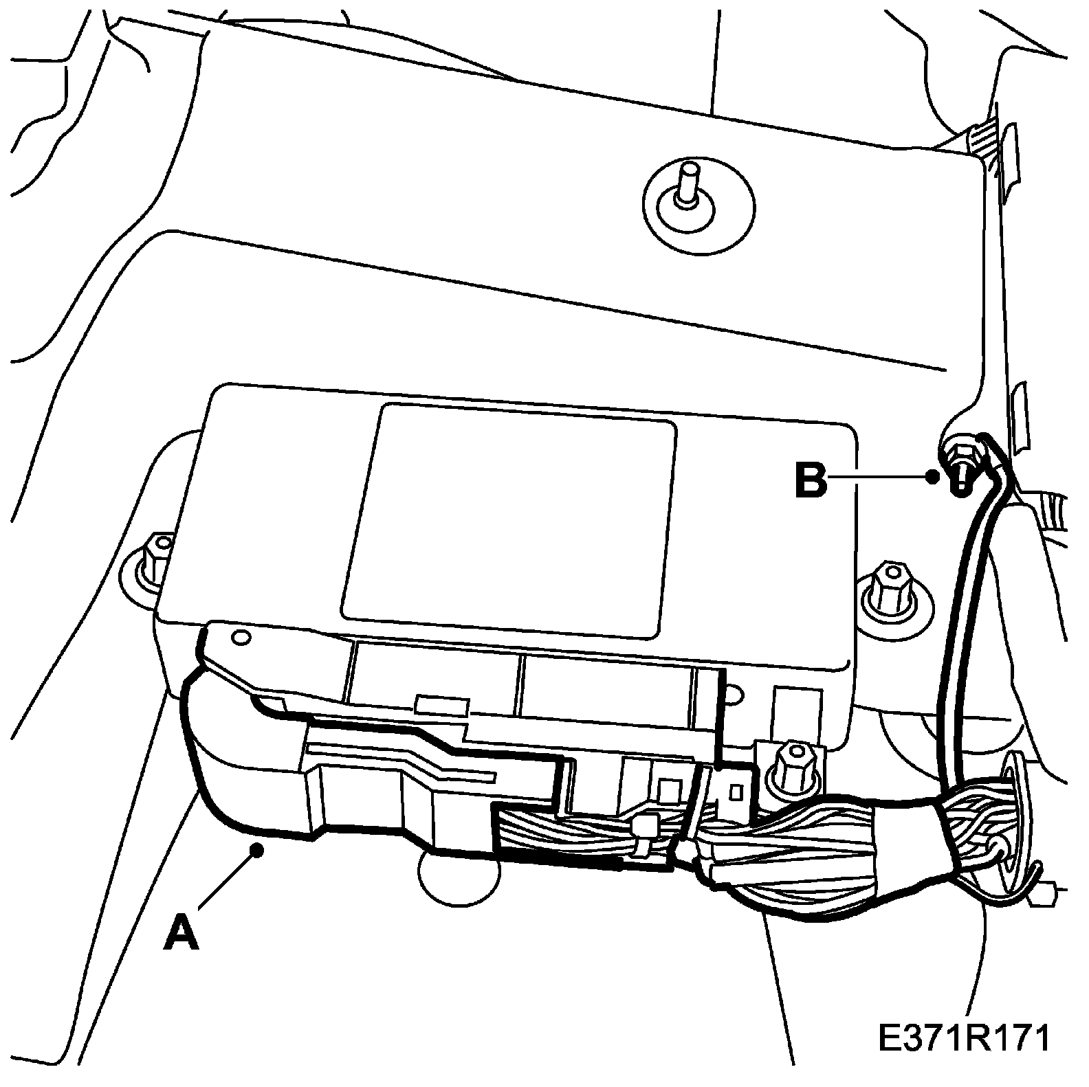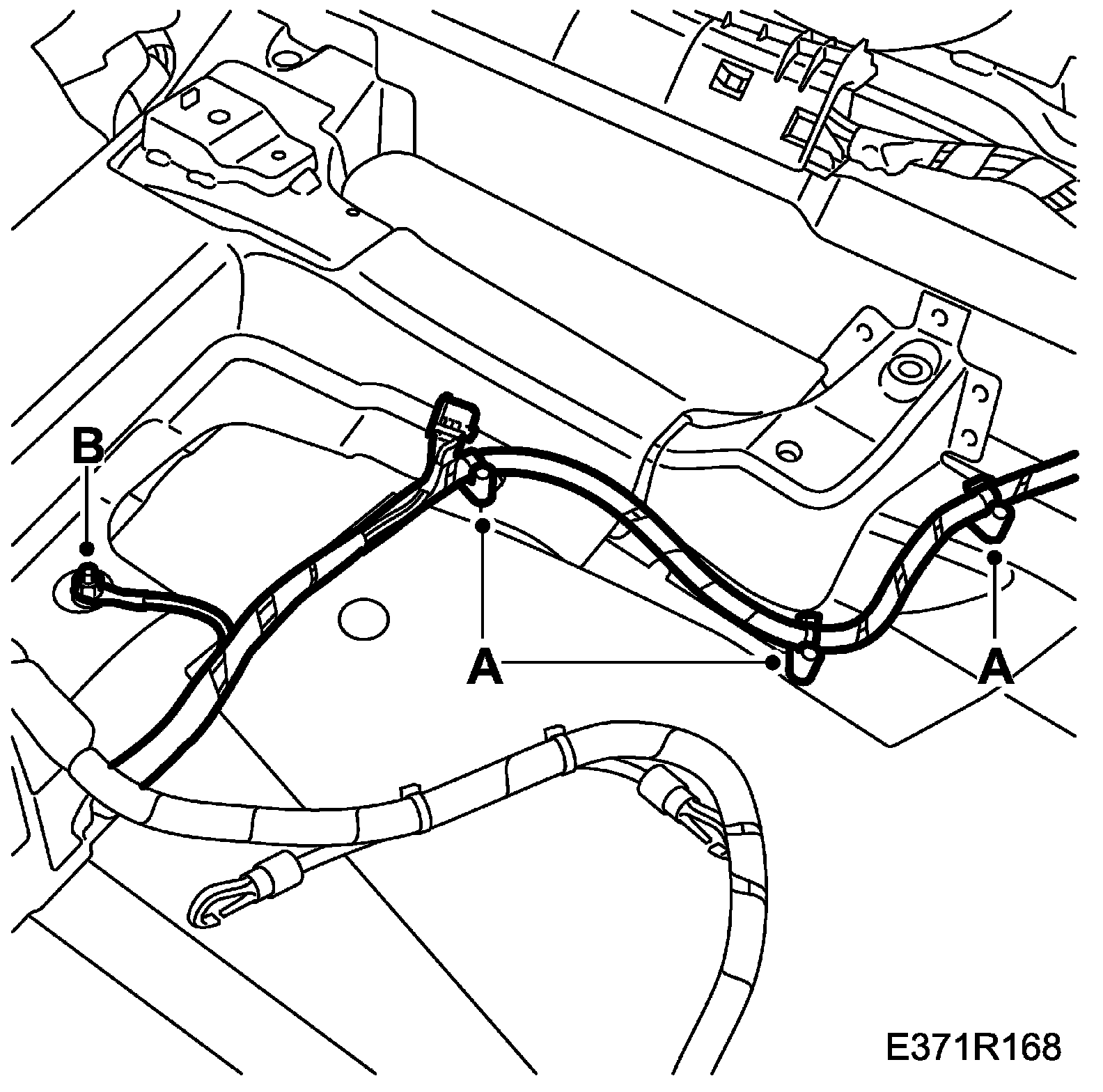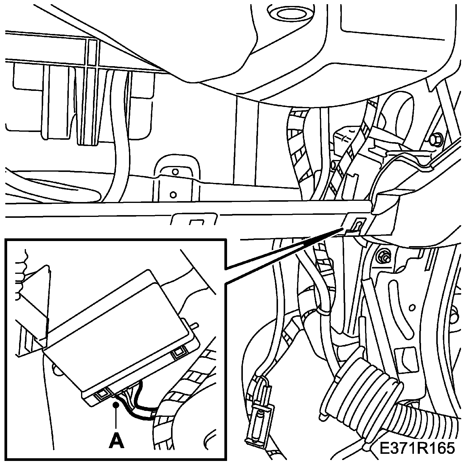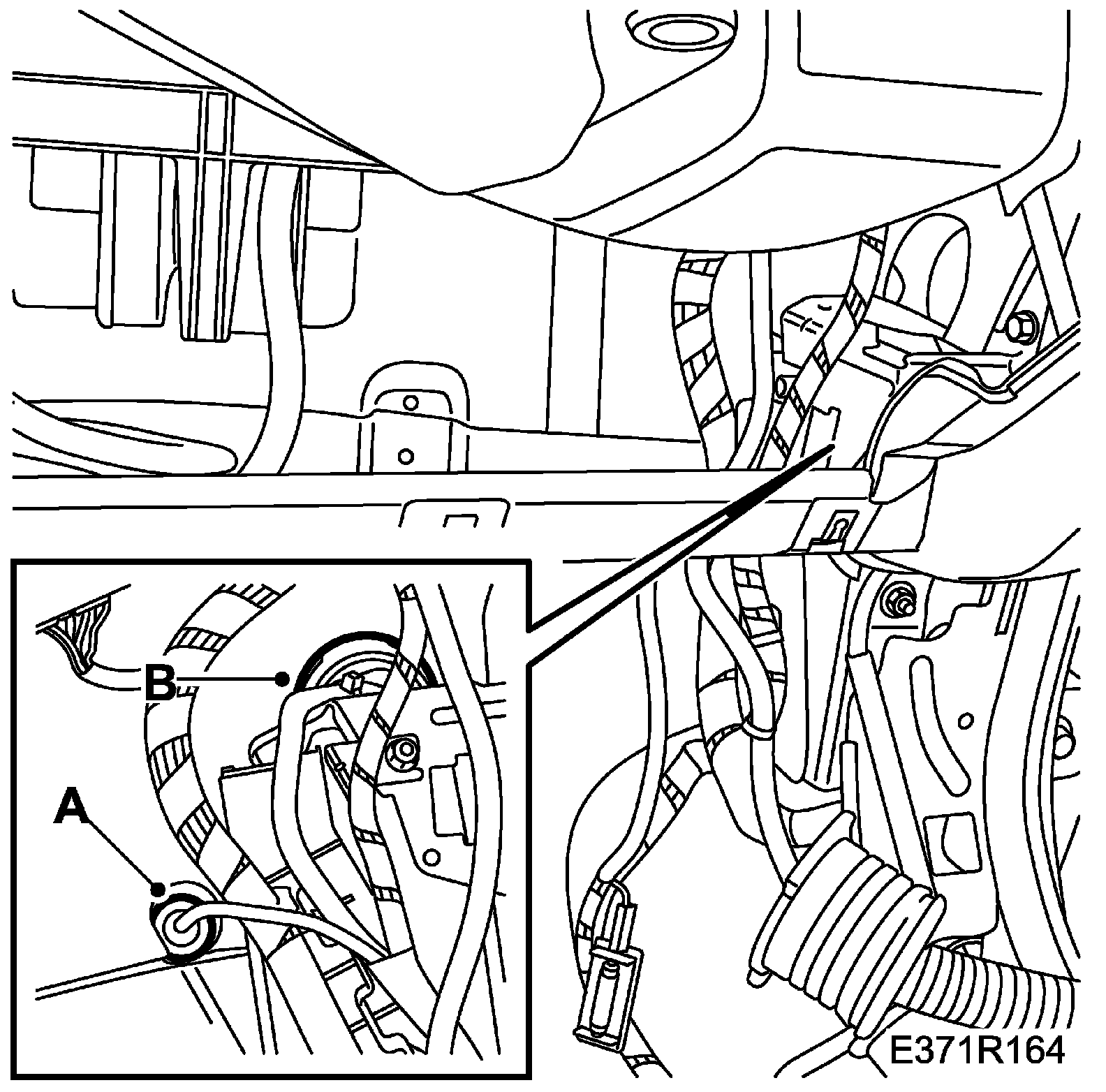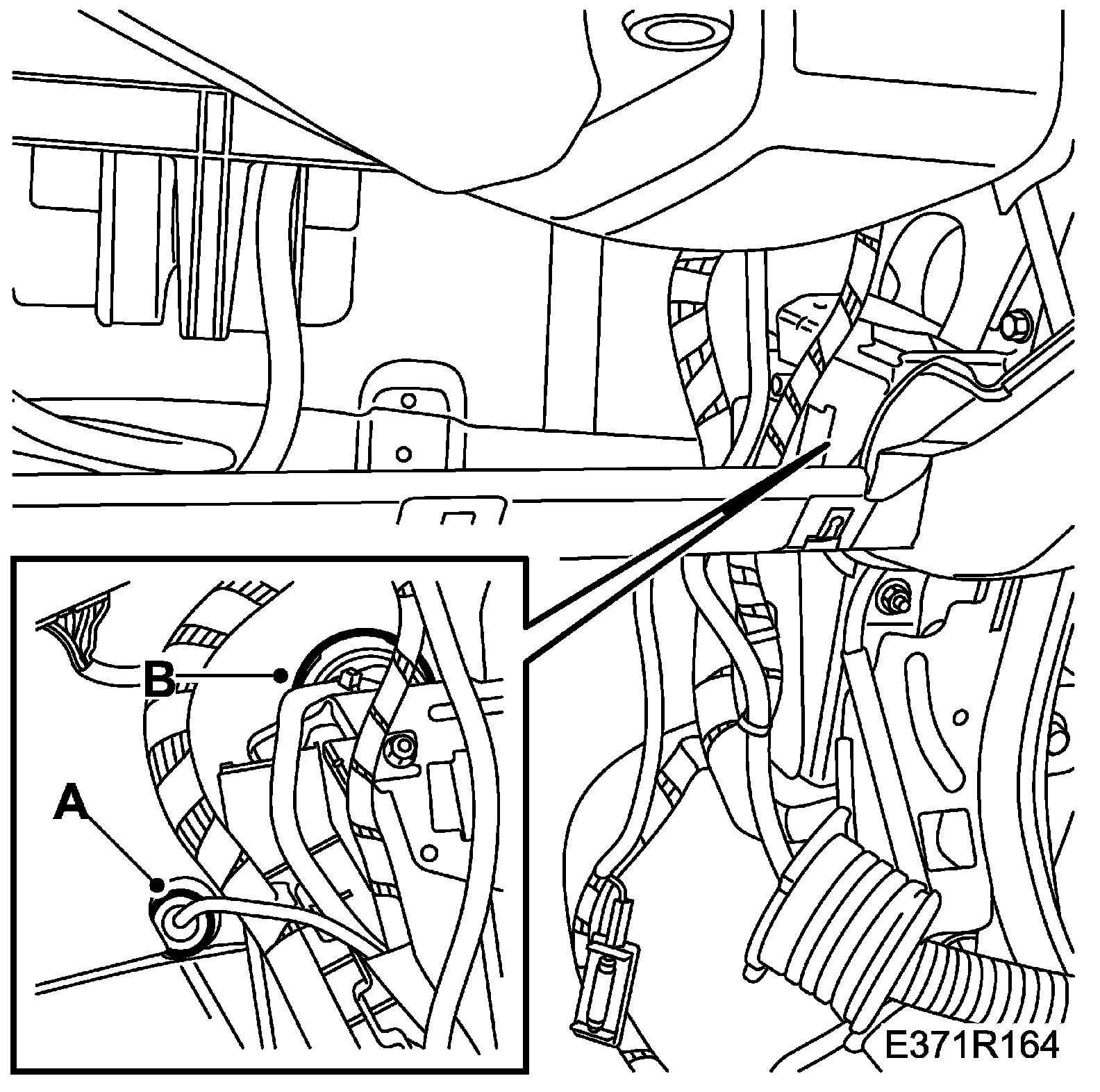 64. Release the wiring harness from its fixings in the floor (A).