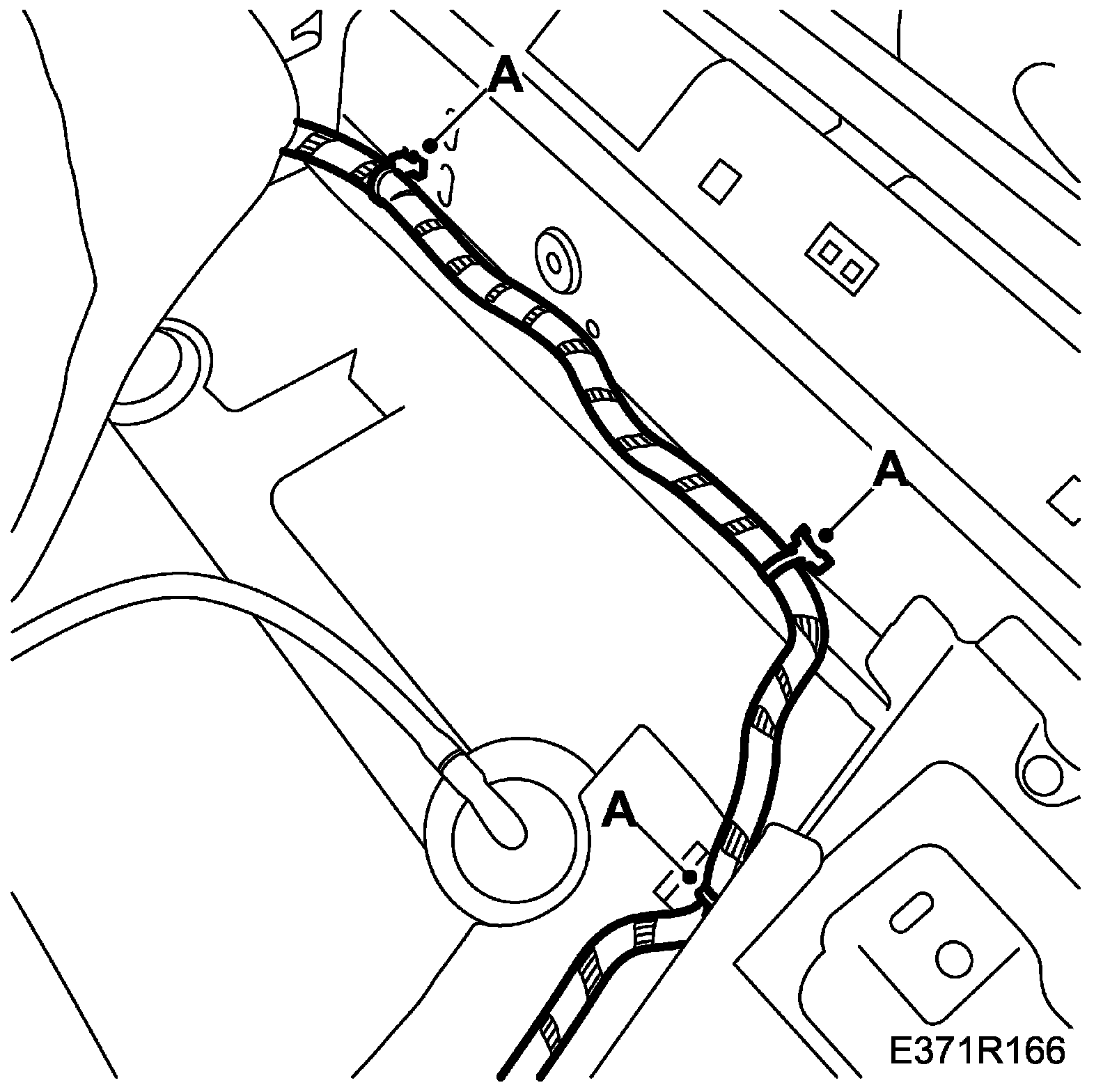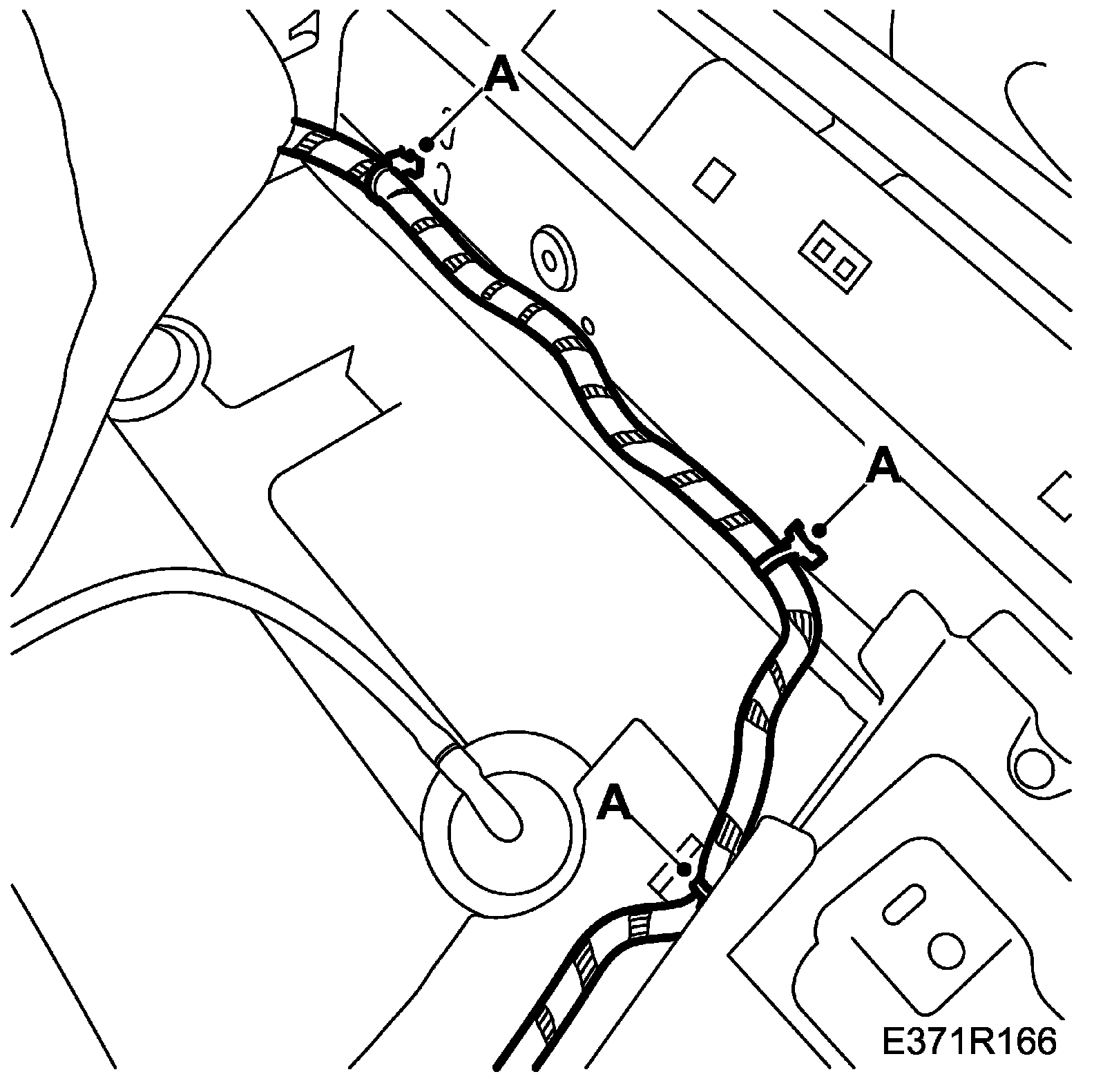 14. Lift up the front right-hand noise insulation panel and attach the wiring harness fixings (A) along the sill and seat member.