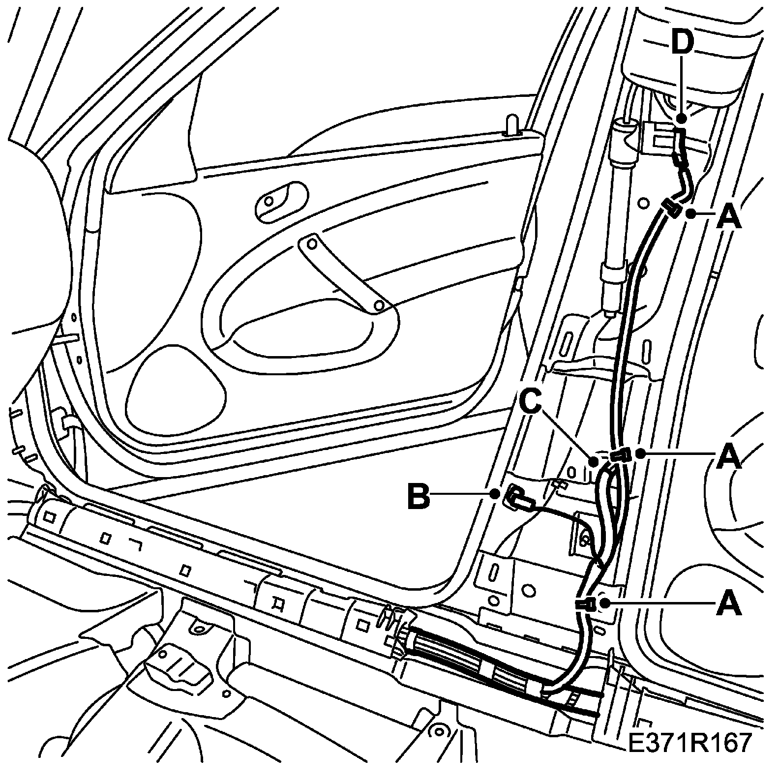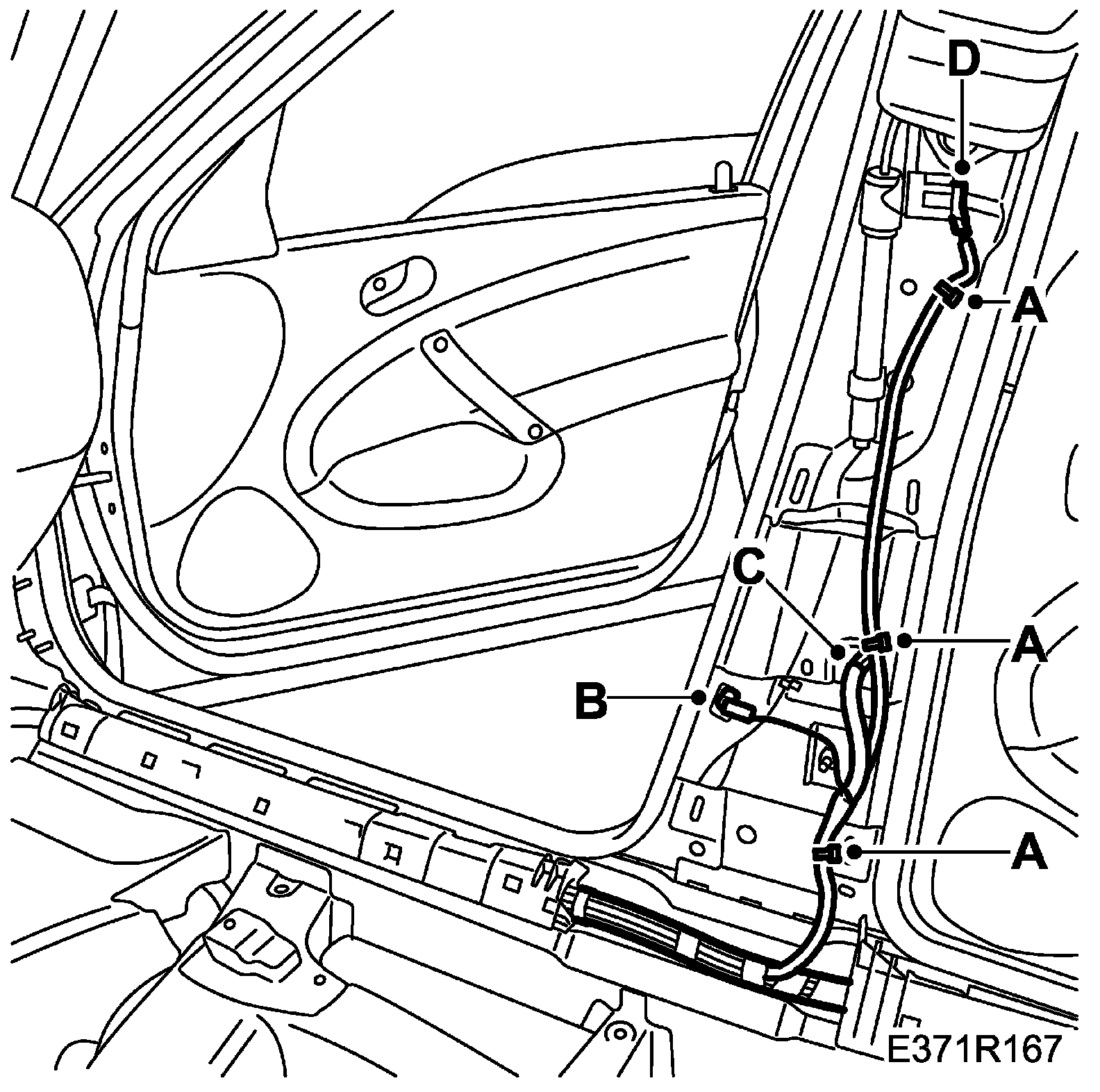 13. Attach the wiring harness fixings to the B-pillar (A). Attach the connector housings on the B-pillar, door switch (B), for rear door harness (C) and seat-belt tensioner (D).