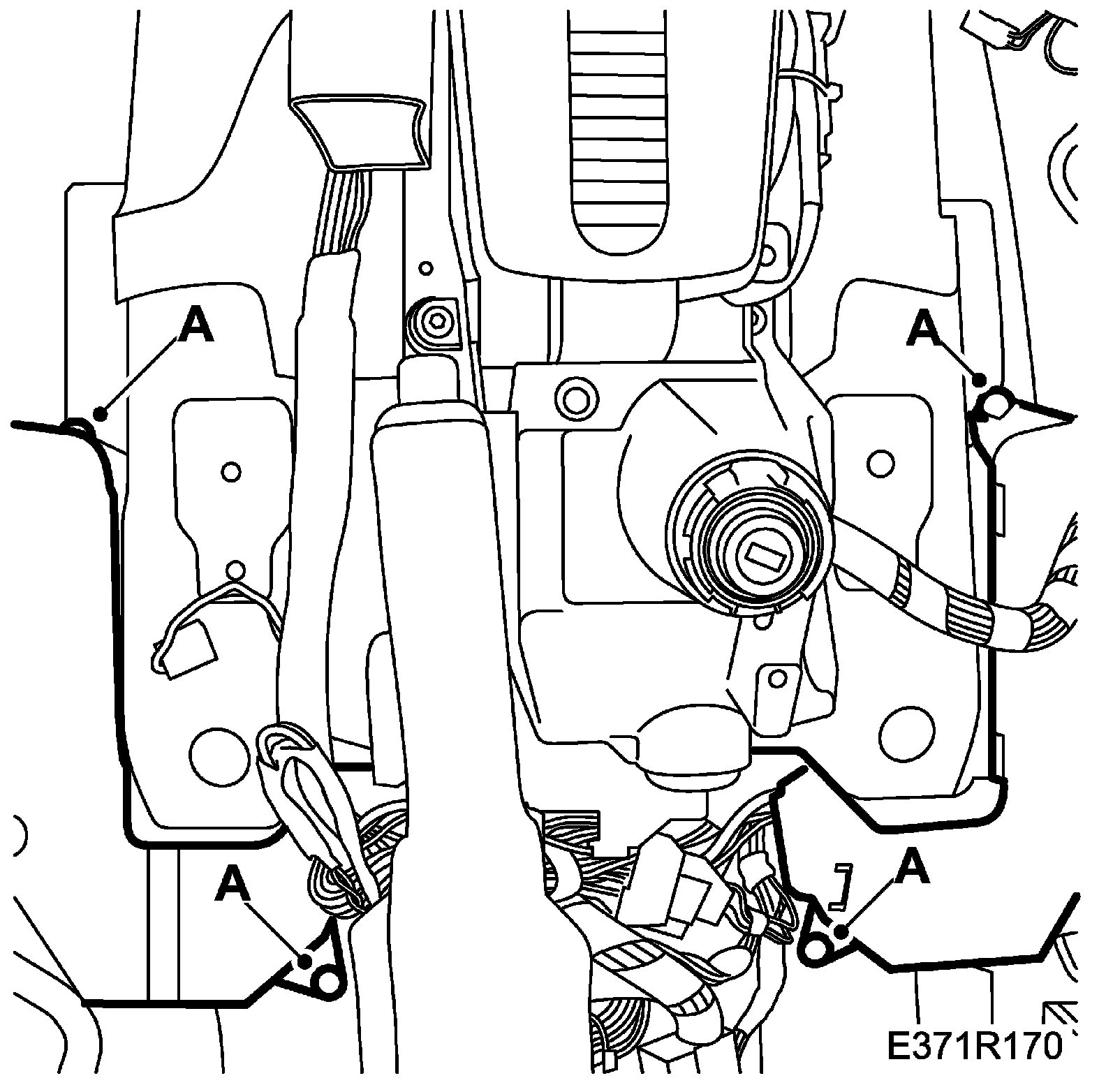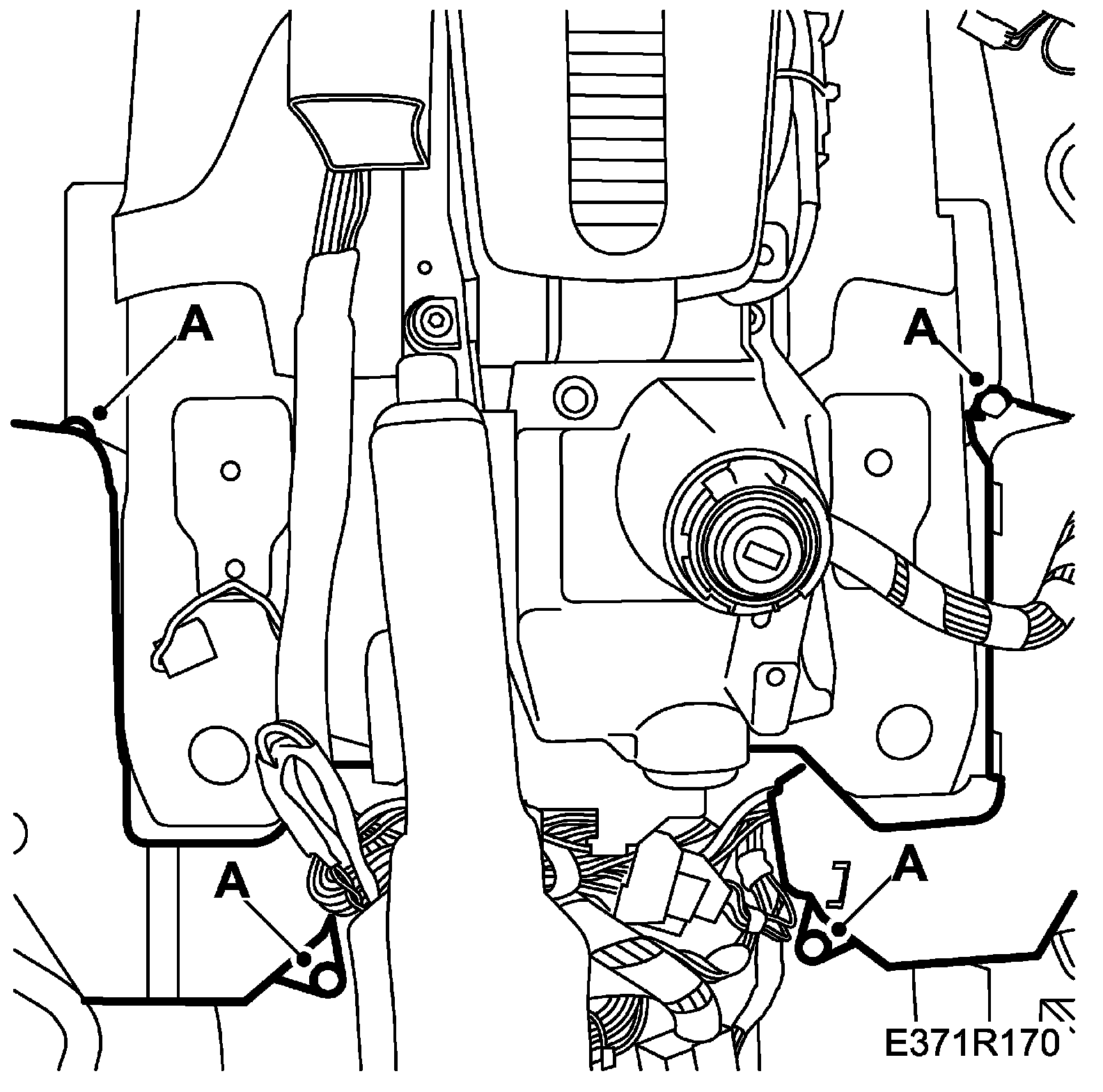 68. Remove the weld screw nuts (A) for the wiring harness fixings above the centre tunnel.