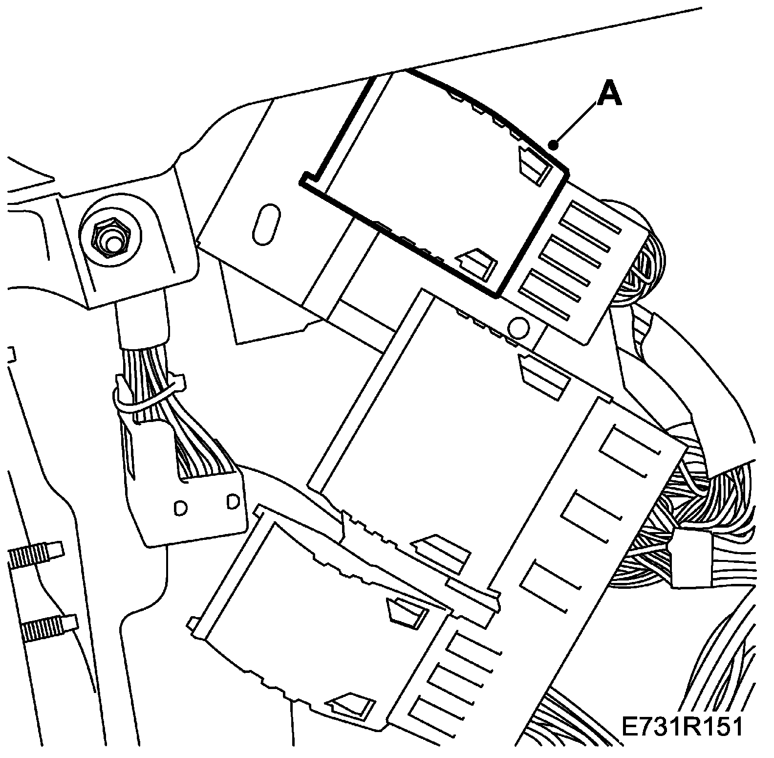 28. Remove the DICE control module (A) and detach the connector housing for DICE.