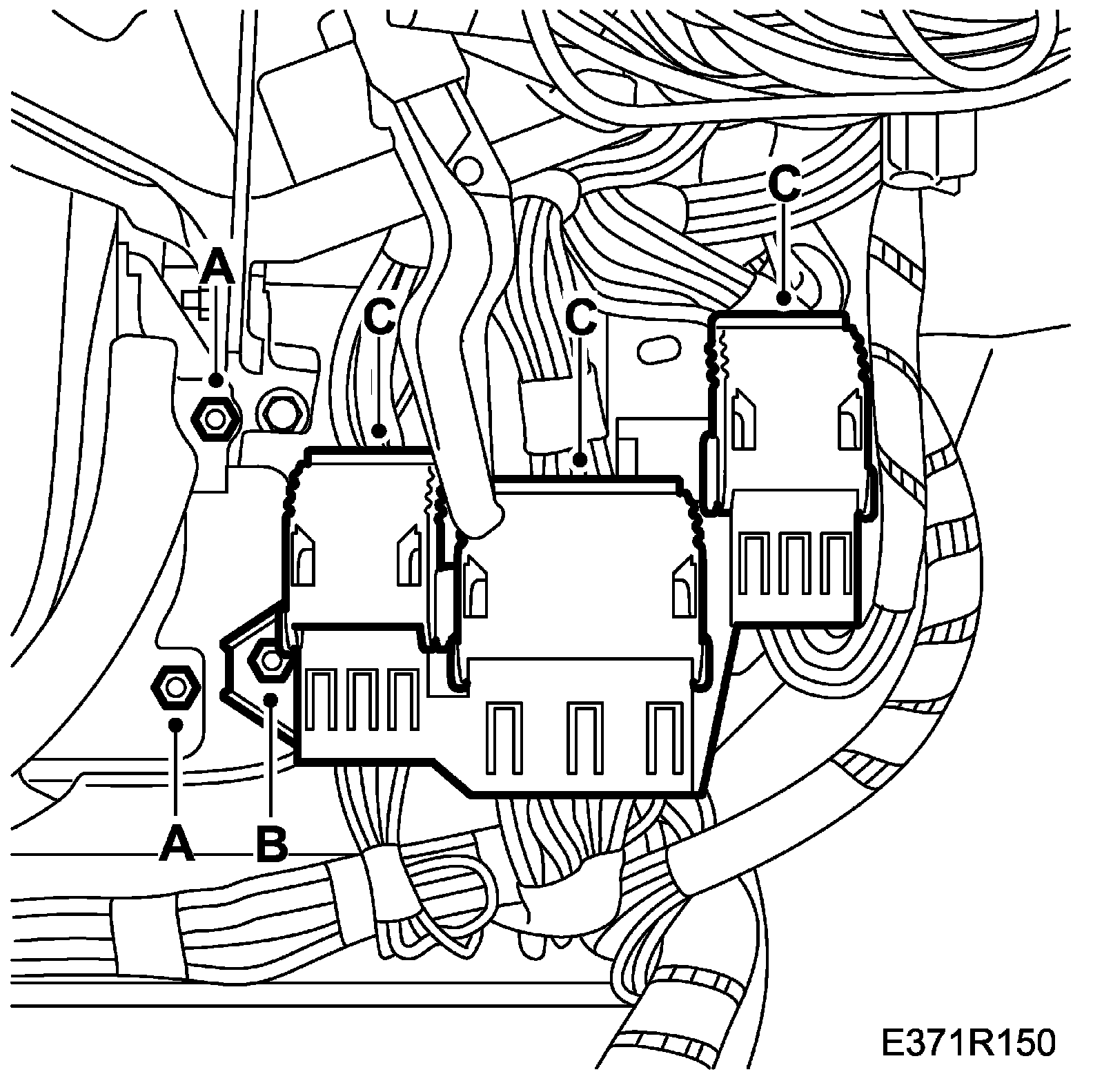 9. Attach the connector housings on the centre tunnel (C).