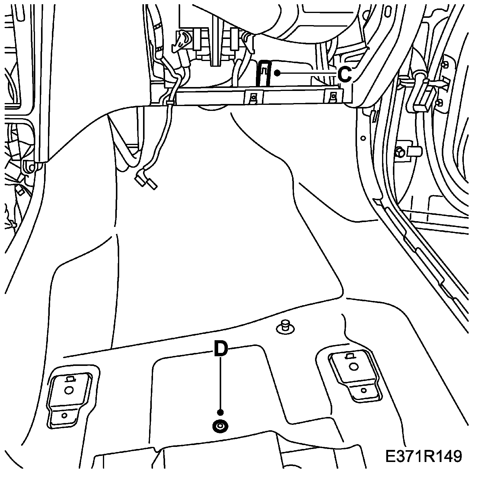 19. Remove the mat's two-stage rivets (D) on the passenger side.
