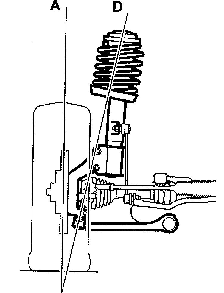 Swivel pin inclination is the angle between the swivel axis (D) (an imaginary line running through the ball bearing in the upper spring cup and the steering swivel member's ball joint) and the vertical (A). It is given in degrees.