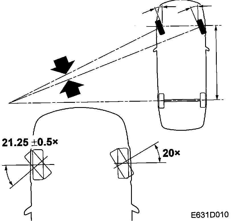 Rear wheel toe-in is adjusted by moving the longitudinal links attached to the body outwards (to reduce toe-in) or inwards (to increase toe-in). Rear wheel toe-in is always measured relative to the car's axis of symmetry. The axis of symmetry is an imaginary line drawn between the center points of the front and rear axles.