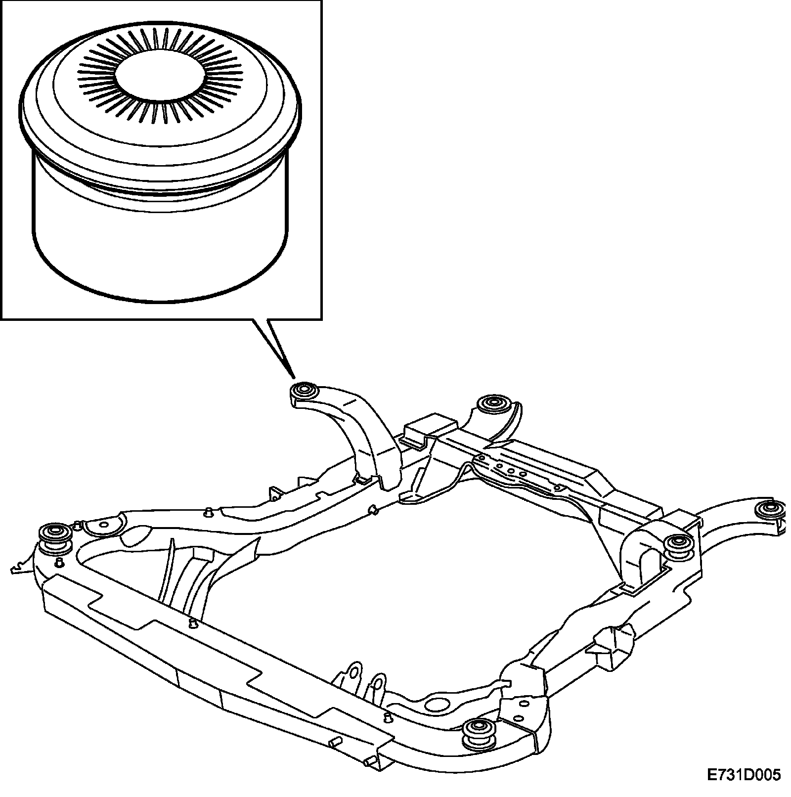 is fastened to the body with bolts and bushes. The middle bushes and bolts are of the type can come loose in case of a collision. This is to provide good energy absorption.