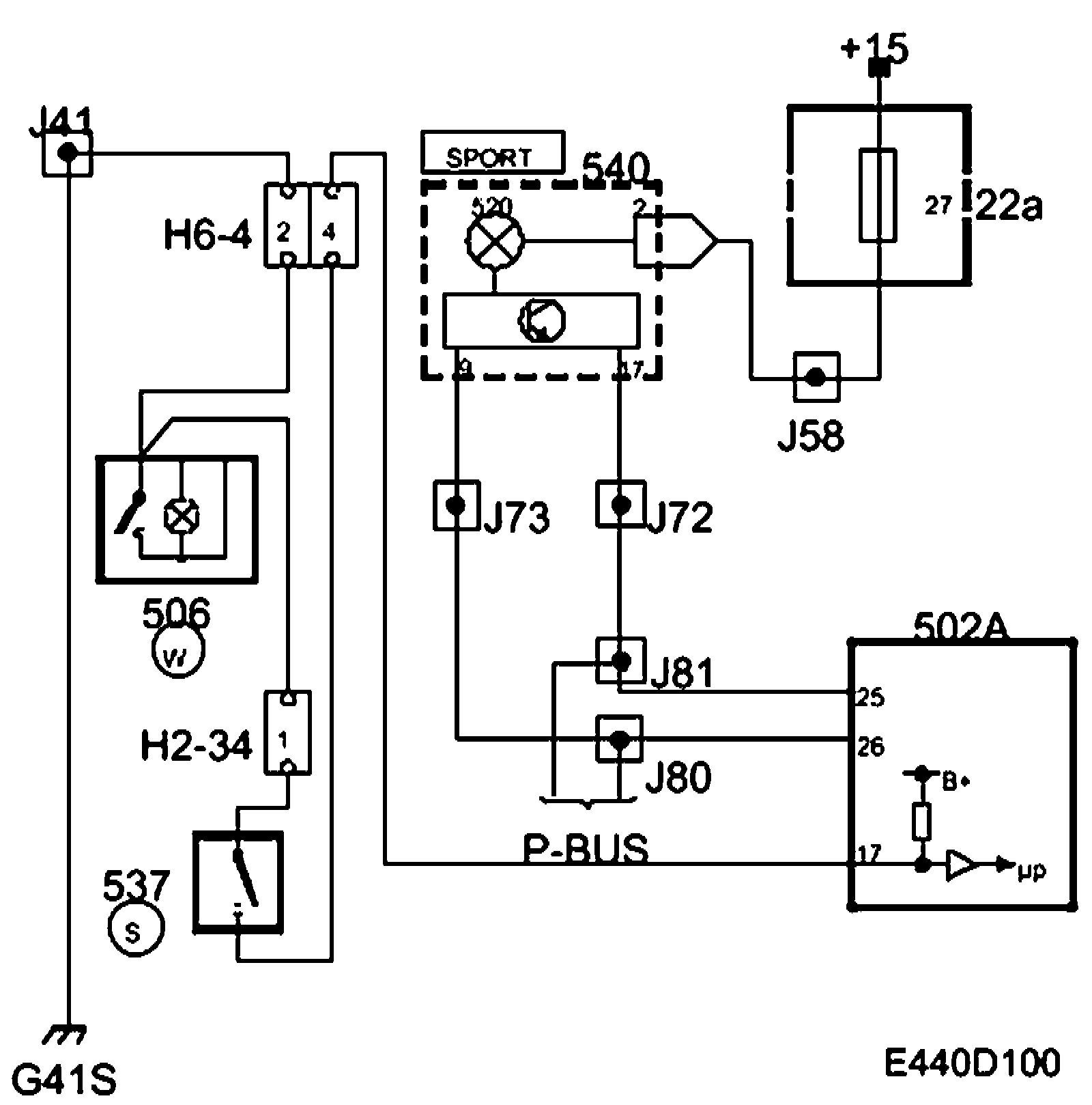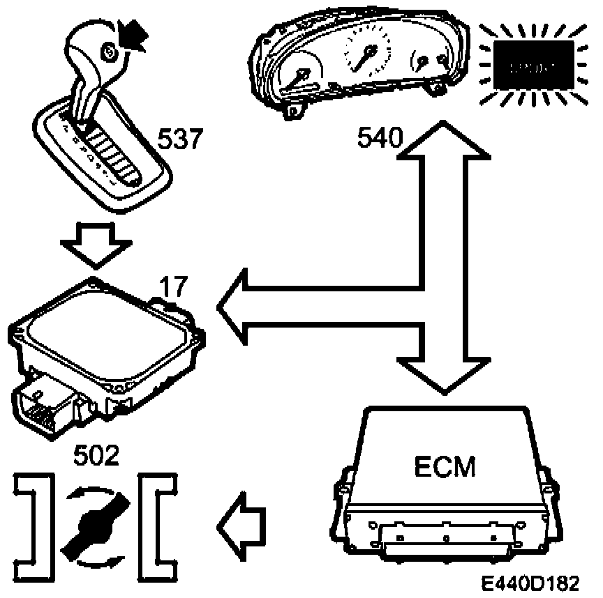 A spring loaded switch button located on the top of the selector lever allows the possibility of shifting between the gear change programmes NORMAL and SPORT. The button has two connections, one to the control module pin 17 (A) and the other to the grounding point G41S. The control module supplies B+ on pin 17 (A). When the button is depressed the circuit is grounded and a change between the gear change programmes occurs.