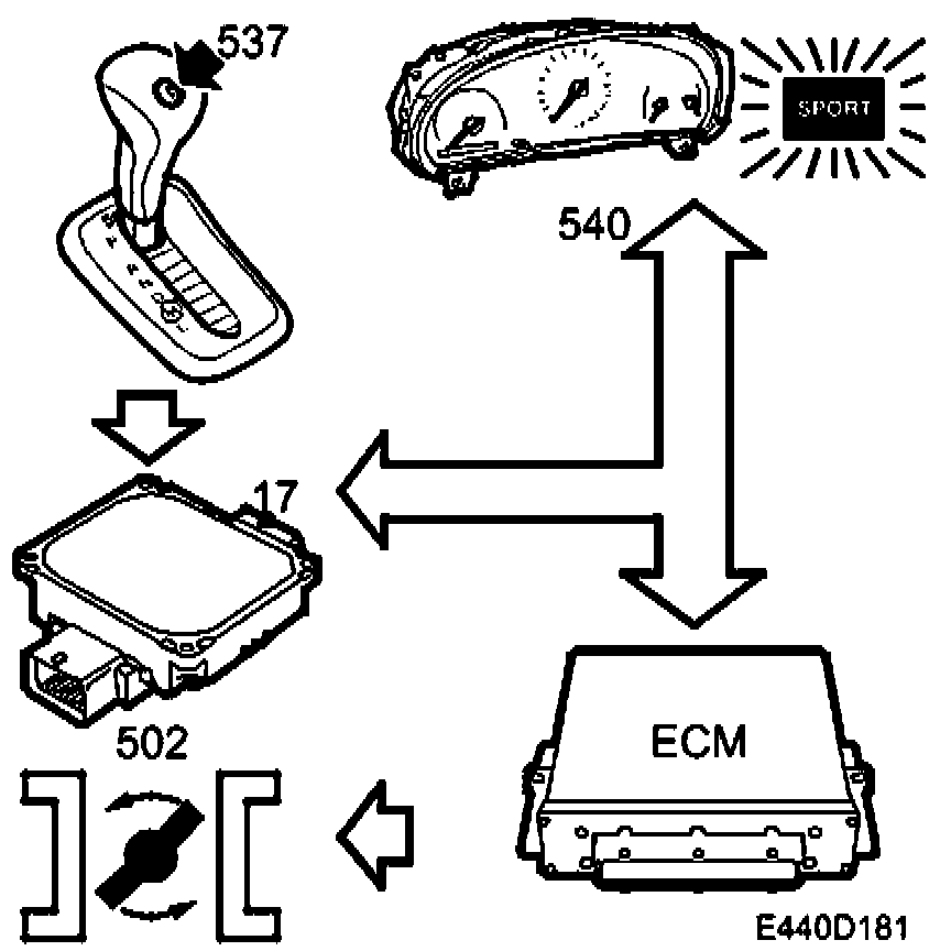 The TCM transmits information on the bus about the current gear change programme including the message SPORT with value ON/OFF. (This is used by MIU and Trionic). When SPORT is selected the message "SPORT ON" is transmitted. In this position Trionic increases the air mass/combustion demand which, for a given accelerator position, results in an increased throttle opening and thus increased power. The throttle position is not changed until the accelerator position changes from the position it had when the SPORT button was depressed. This change causes the gear change points to be adapted to performance. The gear change points for both programmes are however identical at moderate and fully open throttle positions. The SPORT indicator light on the main instrument panel is illuminated when the SPORT programme is selected. If whilst SPORT is selected (in position D) the selector is moved to position M, the "SPORT" text on the MIU will be removed. The SPORT function is always activated in position M but this is not indicated by text on the MIU.