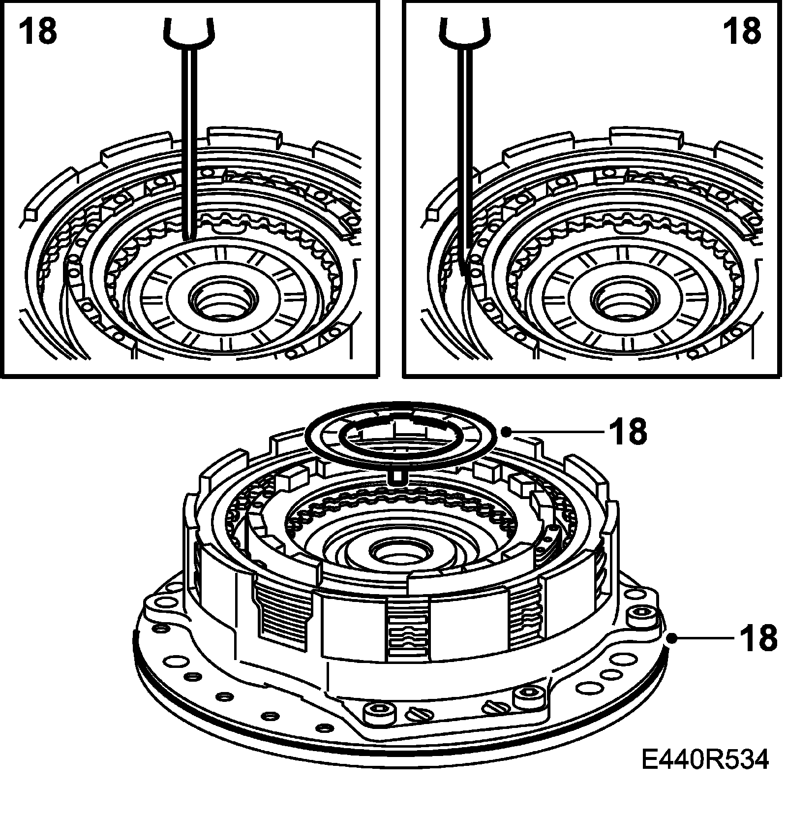 18. Turn the gear case so that the shaft points approx. 45 degrees downward. Apply Vaseline to the O-ring for the oil pump unit. Align the plates using a small screwdriver. Insert the thrust washer greased with Vaseline into brake B1.