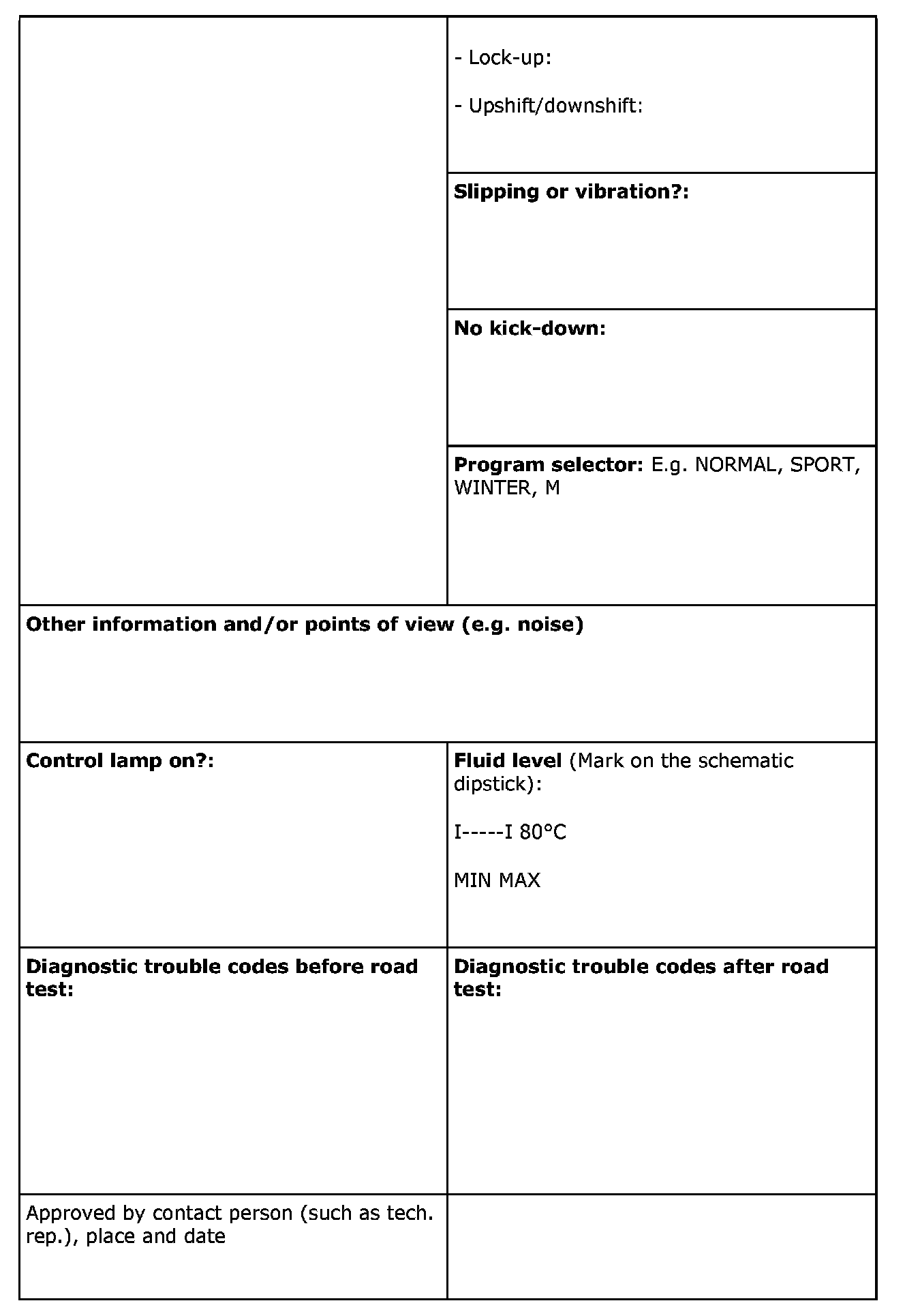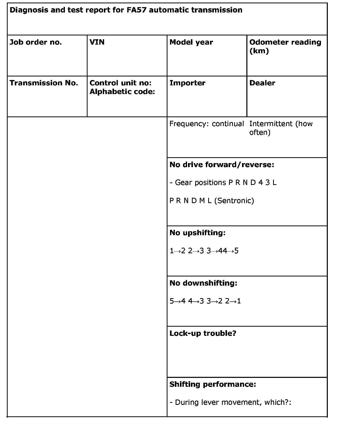 This form must always be filled in if there are any faults, when the transmission is replaced and in connection with claims under warranty.