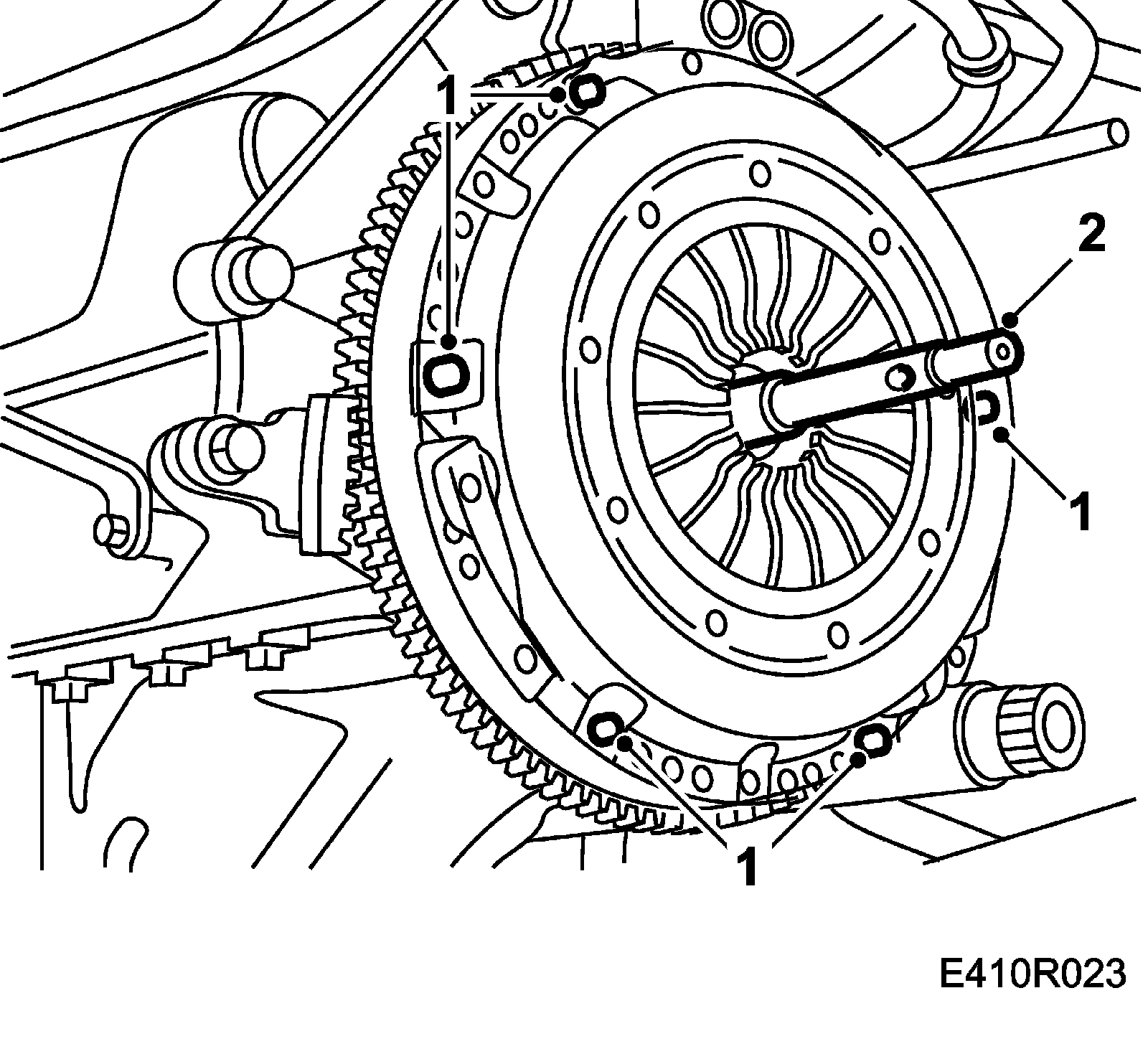 1. Place the driven plate and pressure plate on the flywheel and loosely fit the screws.