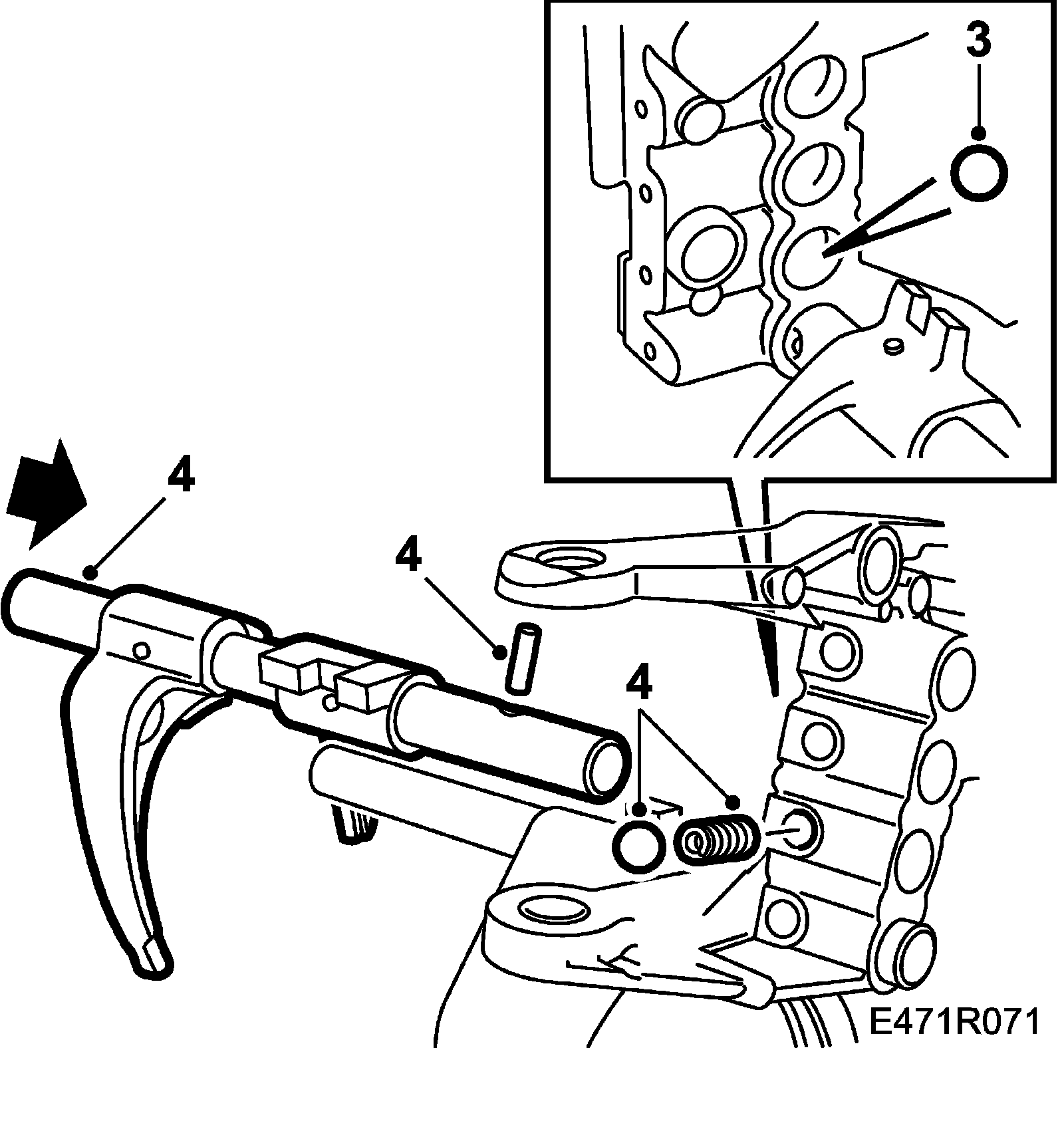4. Insert spring and ball. Fit the pin in 3rd/4th selector shafts and check that it moves easily in the shaft. Press down the ball using a drift and move the shaft to neutral.