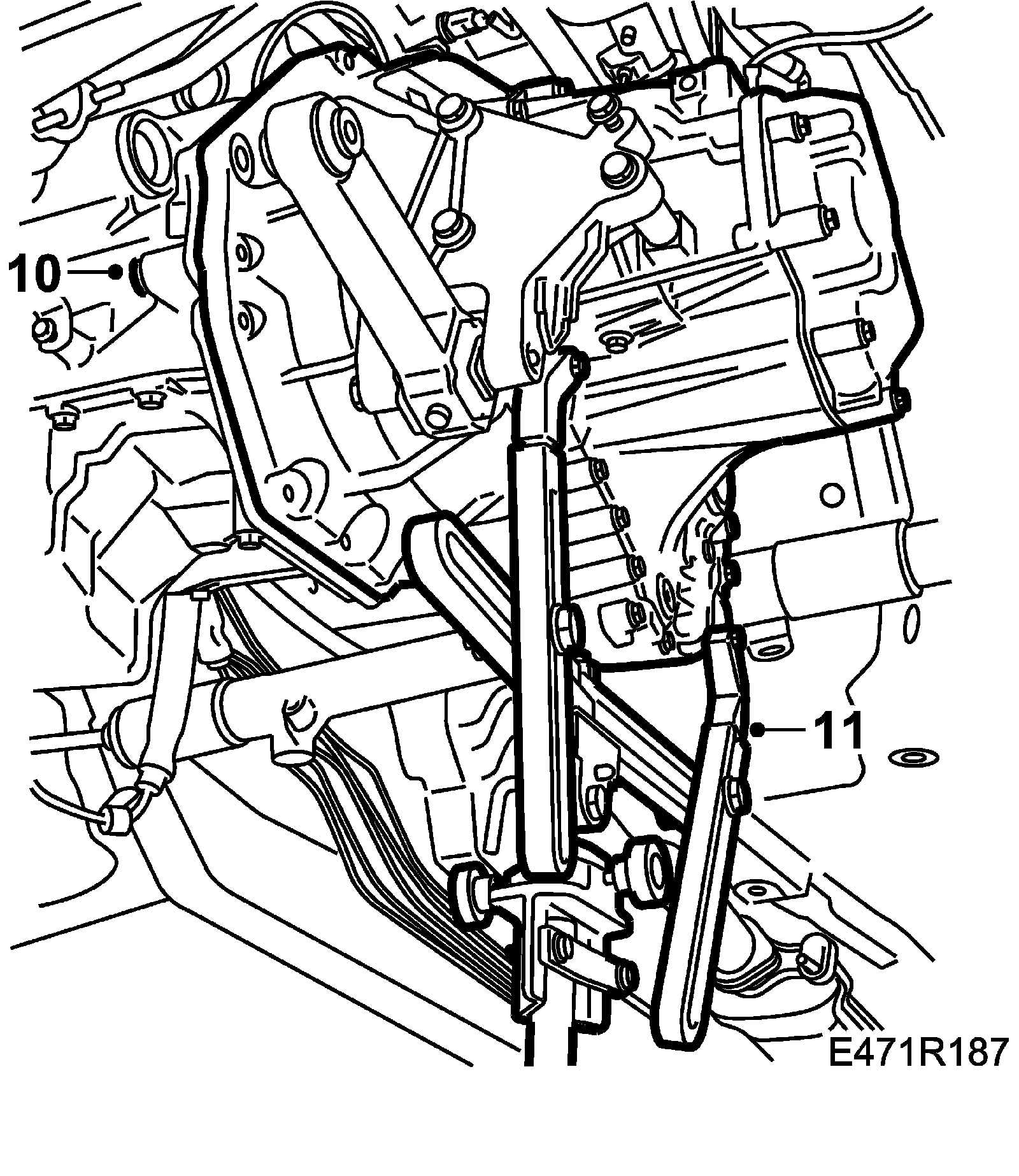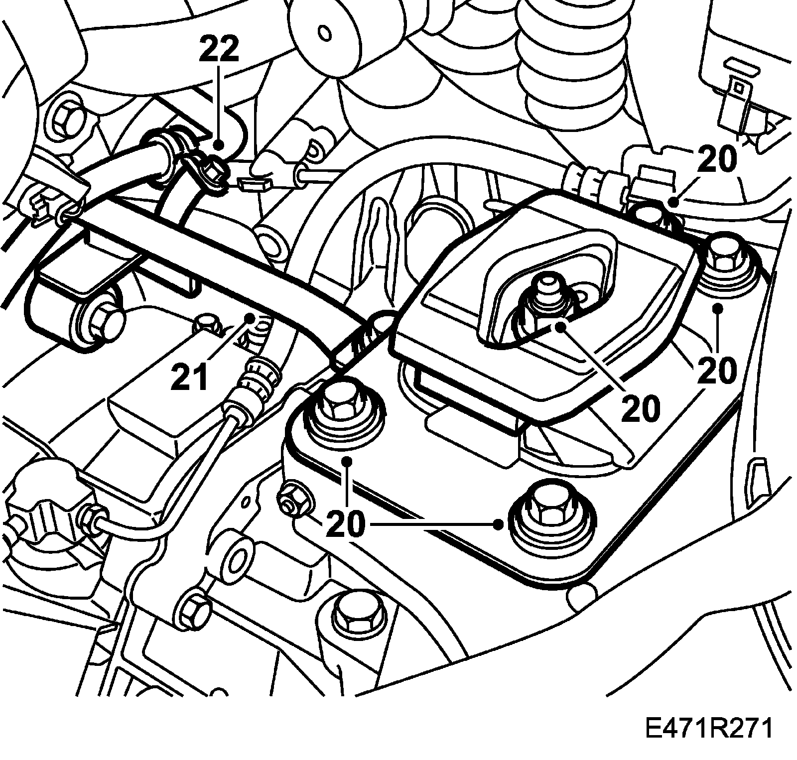 21. Fit the stay (certain models) on the gearbox and the engine pad. Tighten the other upper bolts on the gearbox.