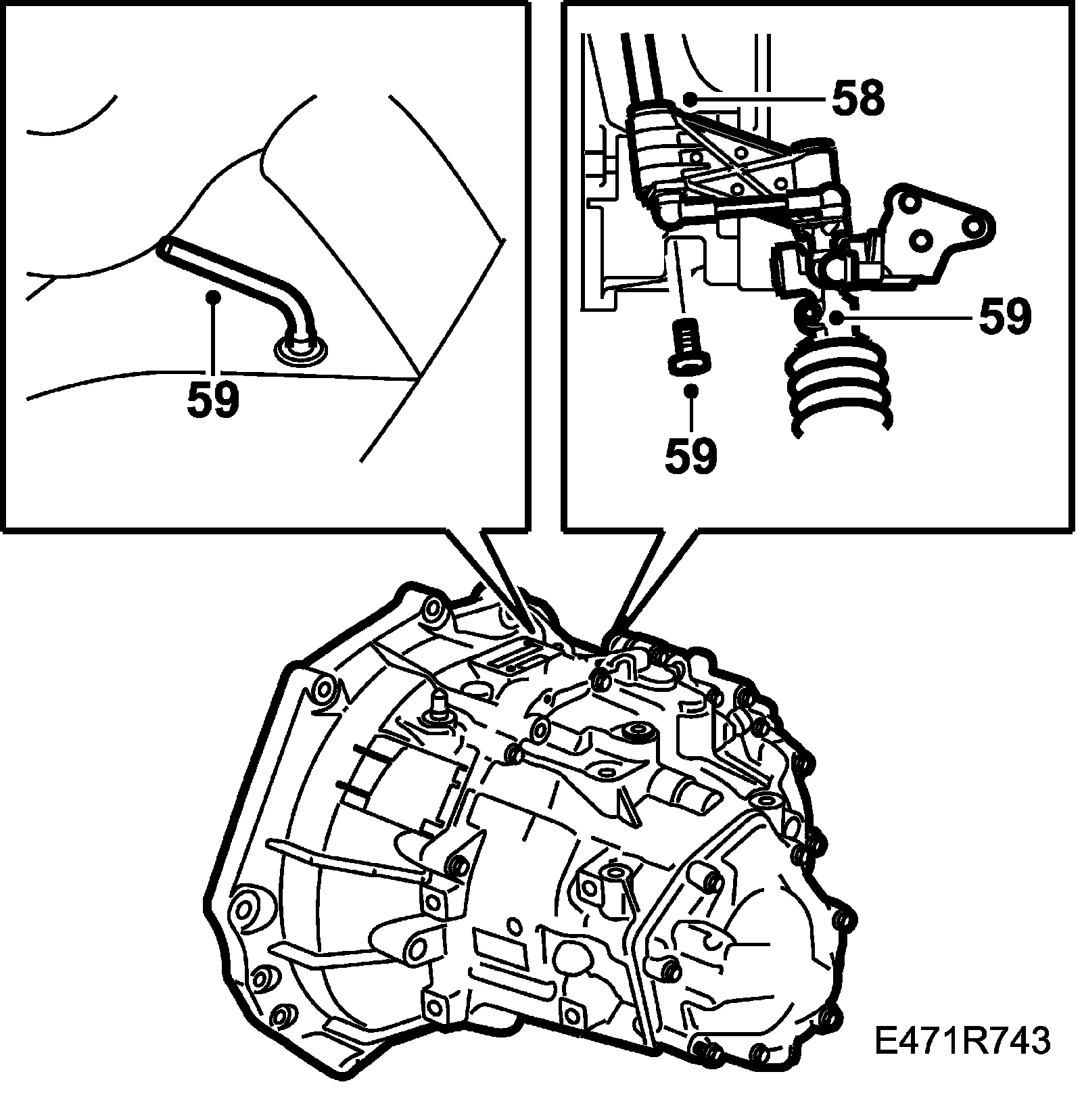 59. Remove the lock pin 87 92 335 Lock pin from the selector rod housing, and connect the gear linkage to the selector rod.