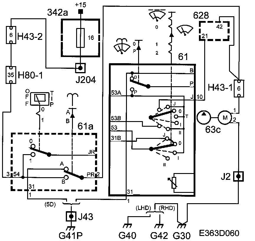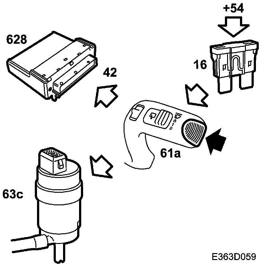 If the rear window wiper button (61a) is pressed, voltage will be applied to DICE pin 42 and the rear window washer pump (63c) from pin 2 on the switch (61a). Voltage is applied to DICE (628) pin 19 from pin 4 on the switch (61a). Pin 12 on DICE grounds pin 5 on the relay (83a) and the motor (62R) is supplied with voltage from the relay (83a) pin 1. The relay (83a) is grounded for 5 seconds after the switch (61a) has been pressed.