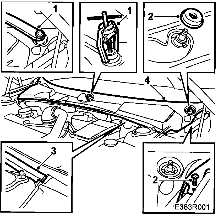 1. Remove the retaining nuts from the windscreen wiper arms. Pull off the wiper arms using 85 80 144 Puller, windscreen wiper arm.