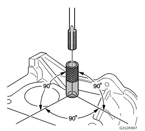 1. Position the fixture plate (3) with the bushing (1) installed over the cylinder head bolt hole to be repaired (4).
