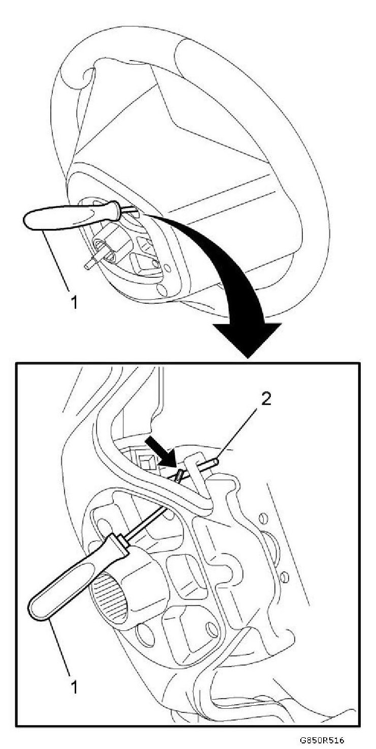9. Bend the locking spring (2) in with a screwdriver (1) in the hole on the back of the steering wheel.