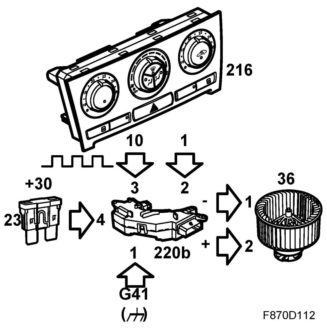 The fan motor is connected to ground through the fan control unit on grounding point G41. Fan motor speed is controlled by the control unit with an increase or decrease of the power supply.